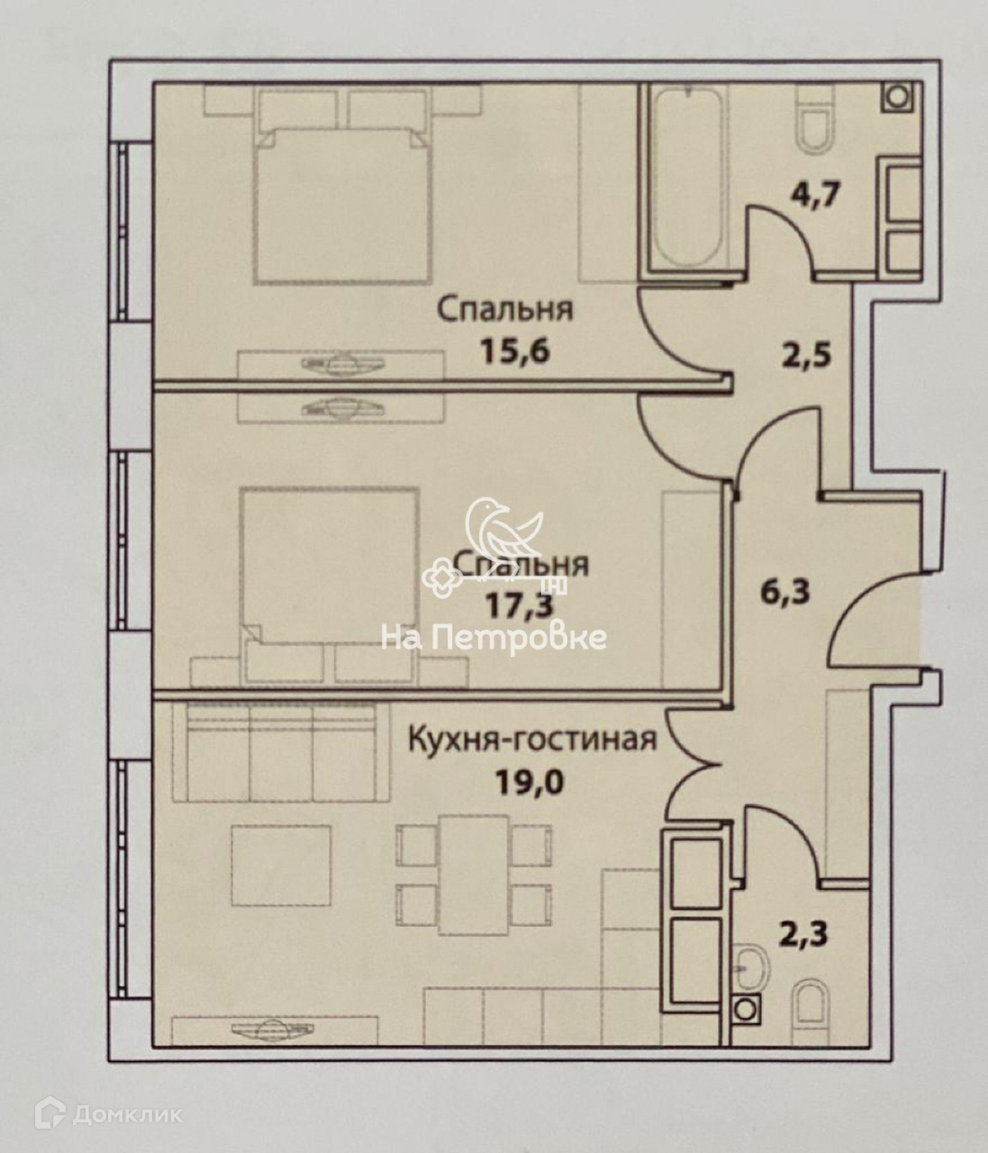 Жилая 35 кв м( 19/16- комнаты изолированные). Кухня-гостинная 15кв м. Два санузла. Холл 6, 3 кв м.