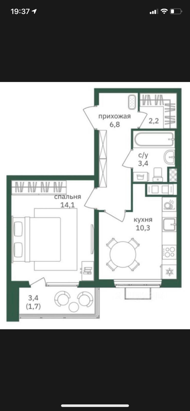 Жилая площадь 14.1 м2