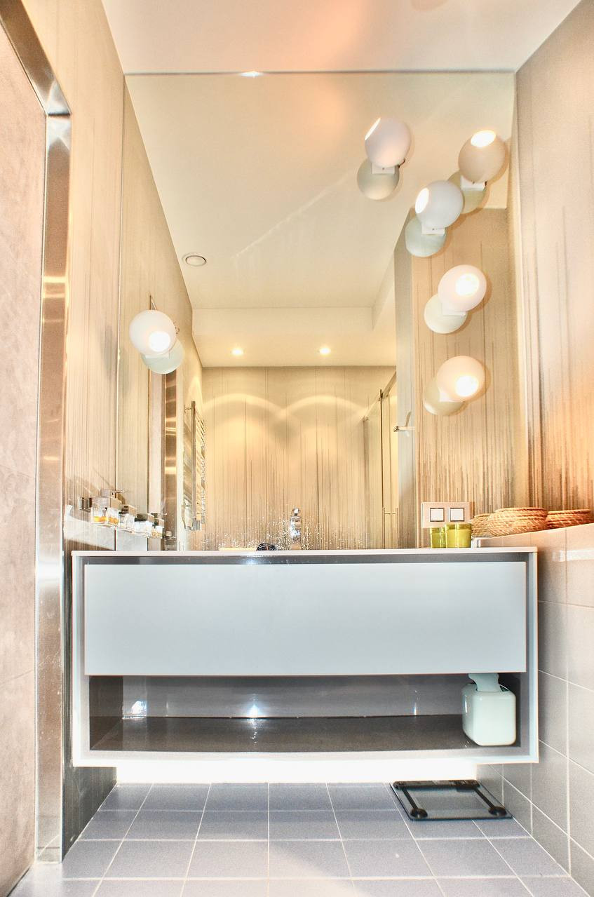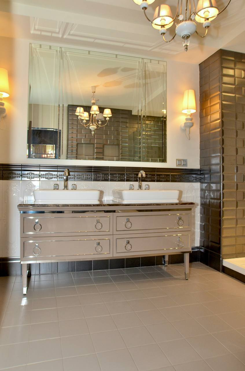 Элегантный внешний вид помещения дополняют изысканные  предметы интерьера выполненные по индивидуальному заказу.