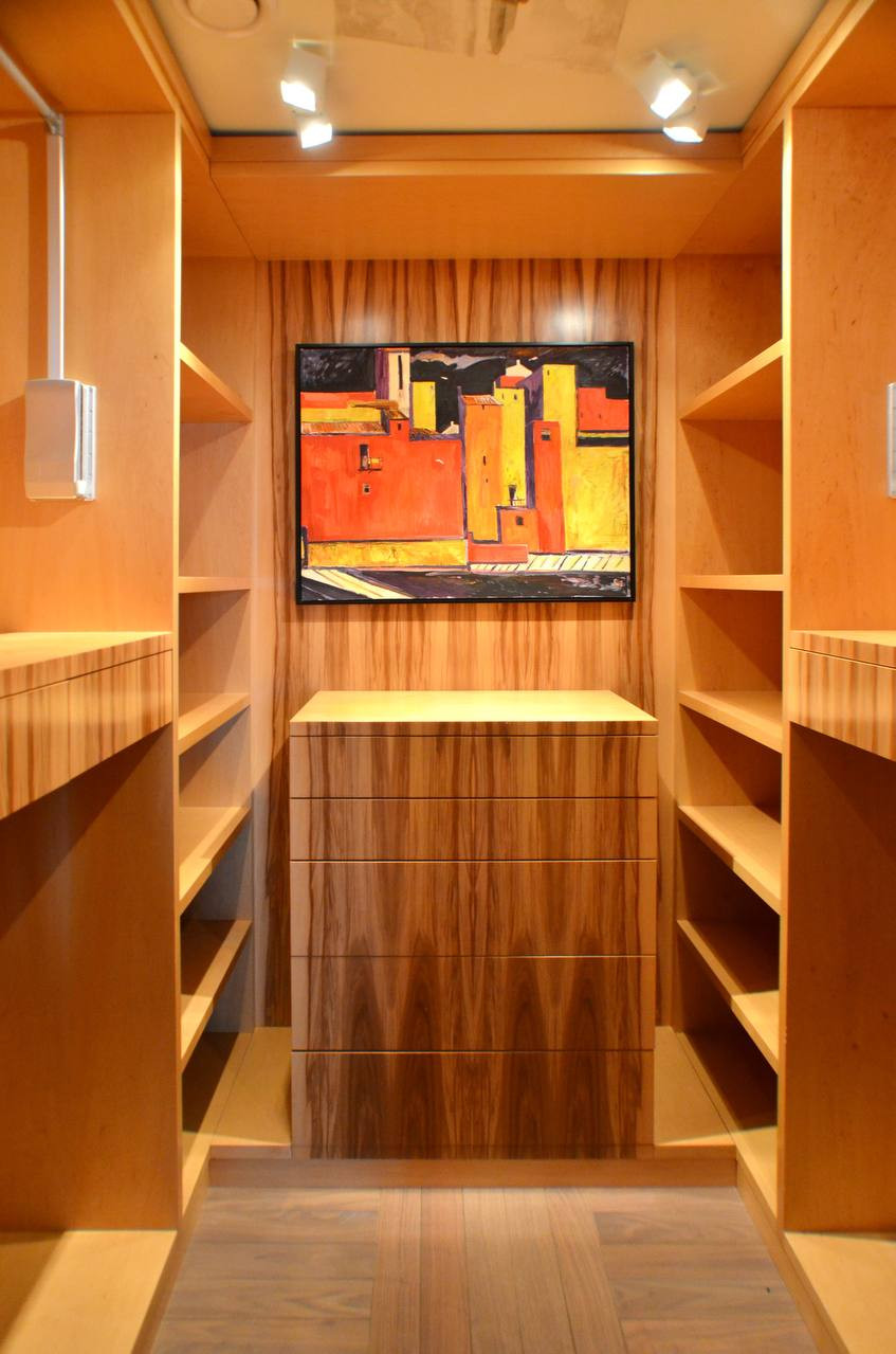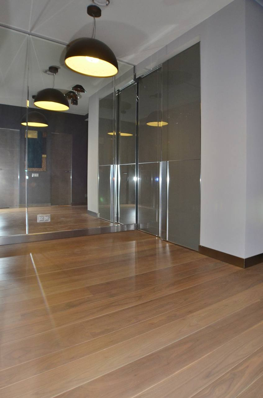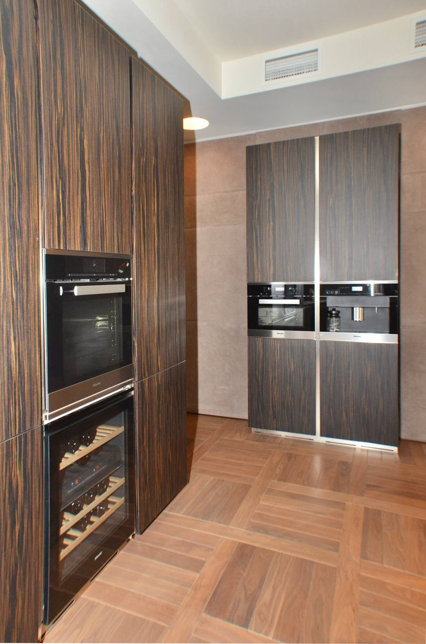 В отделке использовались исключительно премиум материалы: наборный паркет из редких пород дерева; элитная плитка и природный камень; драпировка стен натуральной кожей;  межкомнатные двери и окна премиум класса. В квартире приточно-вытяжная система вентиляции и кондиционирования, теплые полы, внутрипольные конвекторные батареи отопления.