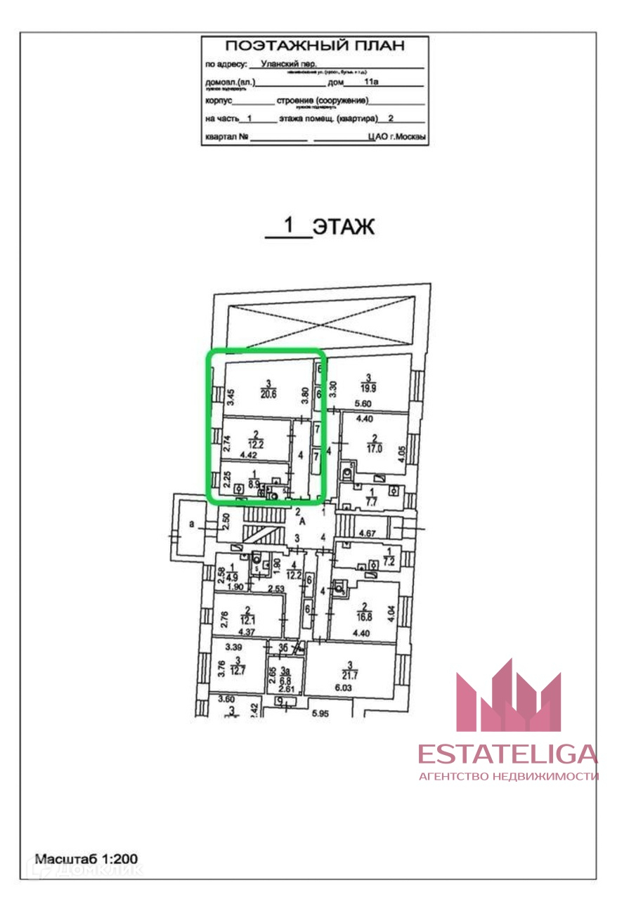 2-комнатная квартира, 51 м2, этаж 1 / 6, на продажу в Москве, Уланский переулок, 11А
