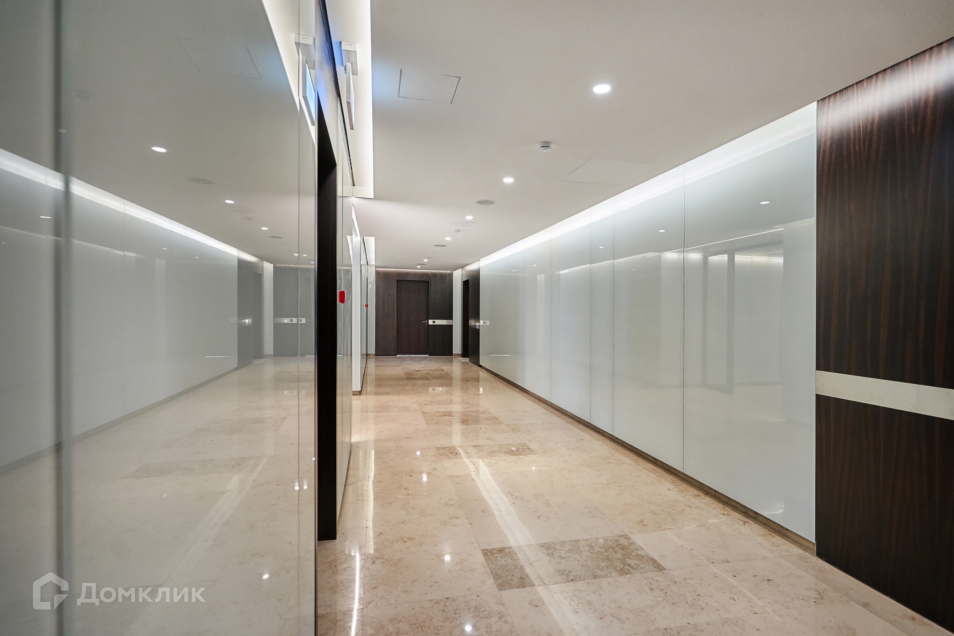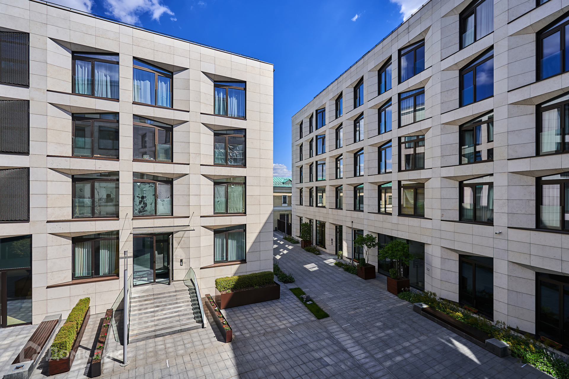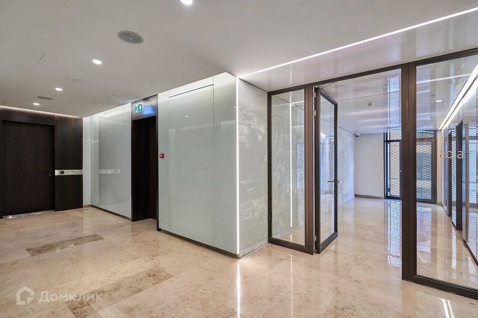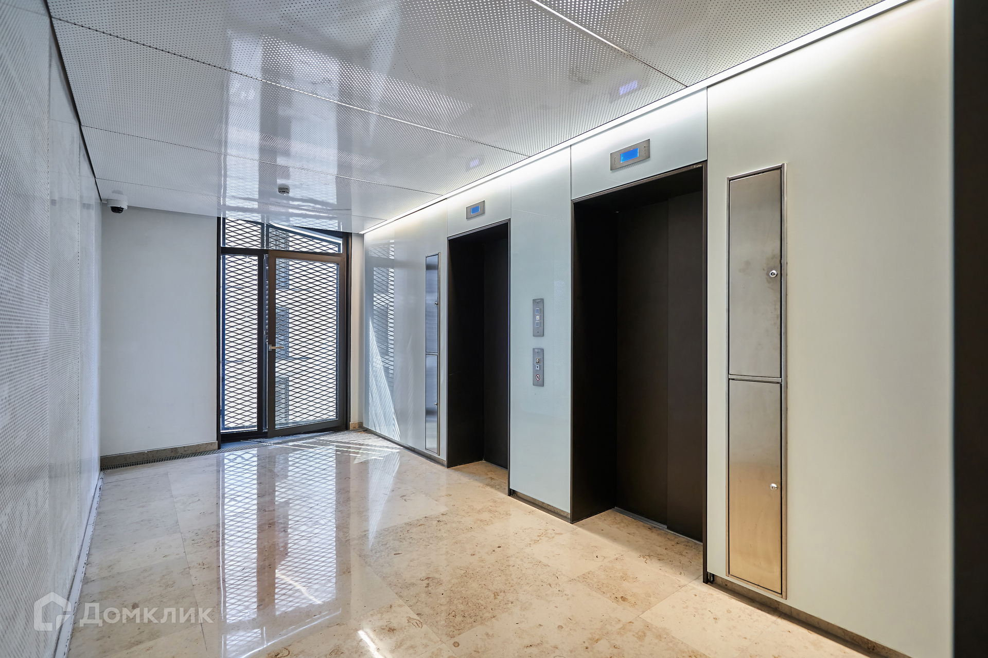 Лобби с отделкой из натурального камня и перфорированного металла выполнено в светлых тонах, украшено витражами.  Для машин предусмотрен подземный двухуровневый паркинг.