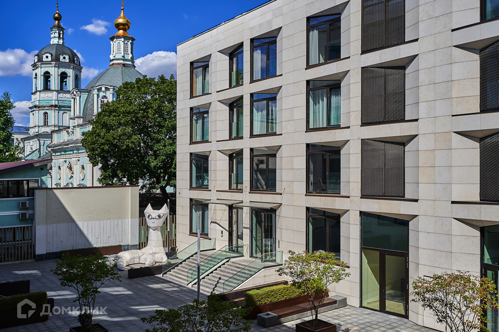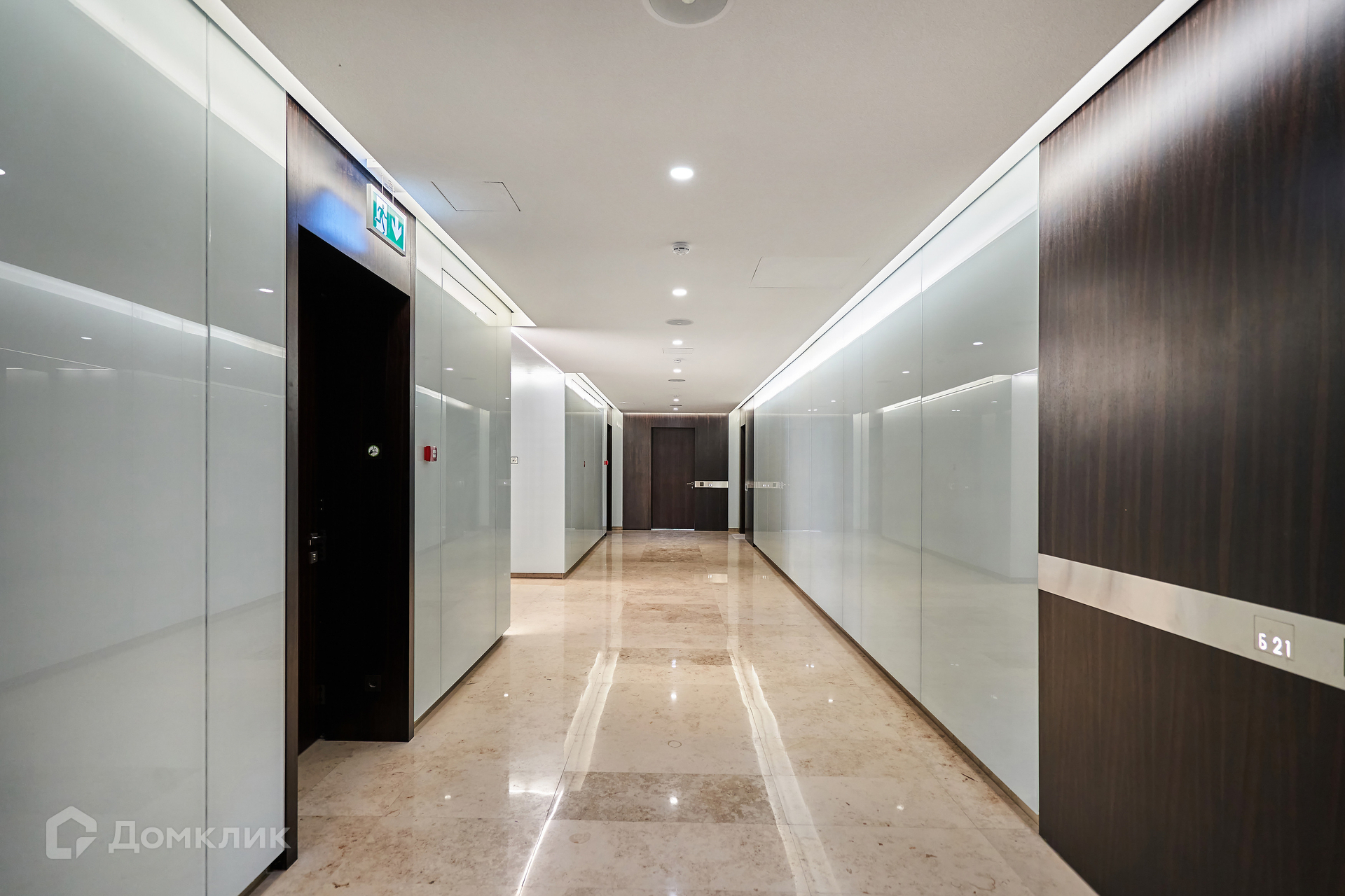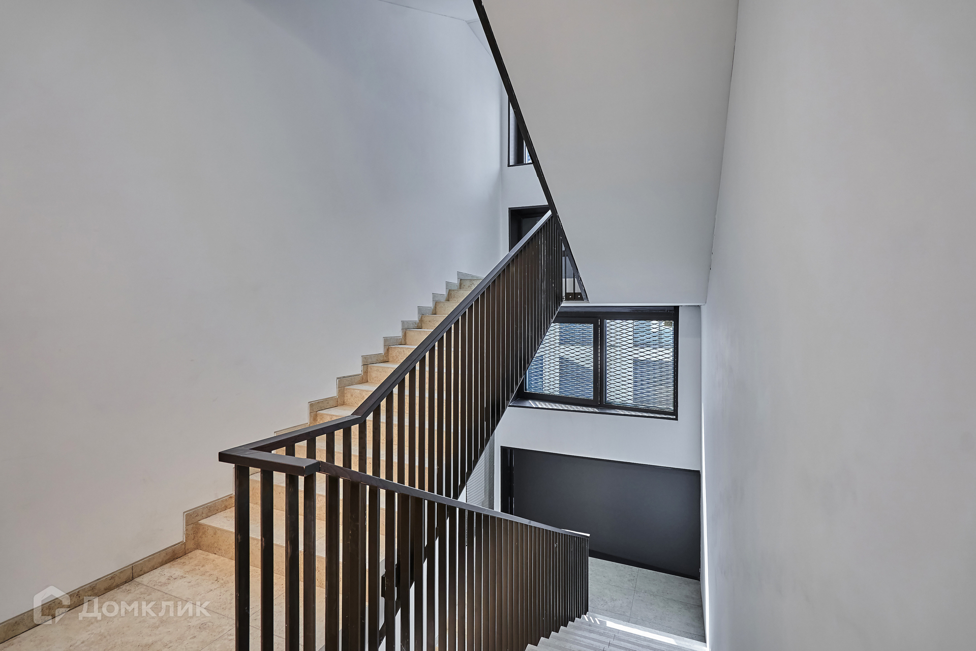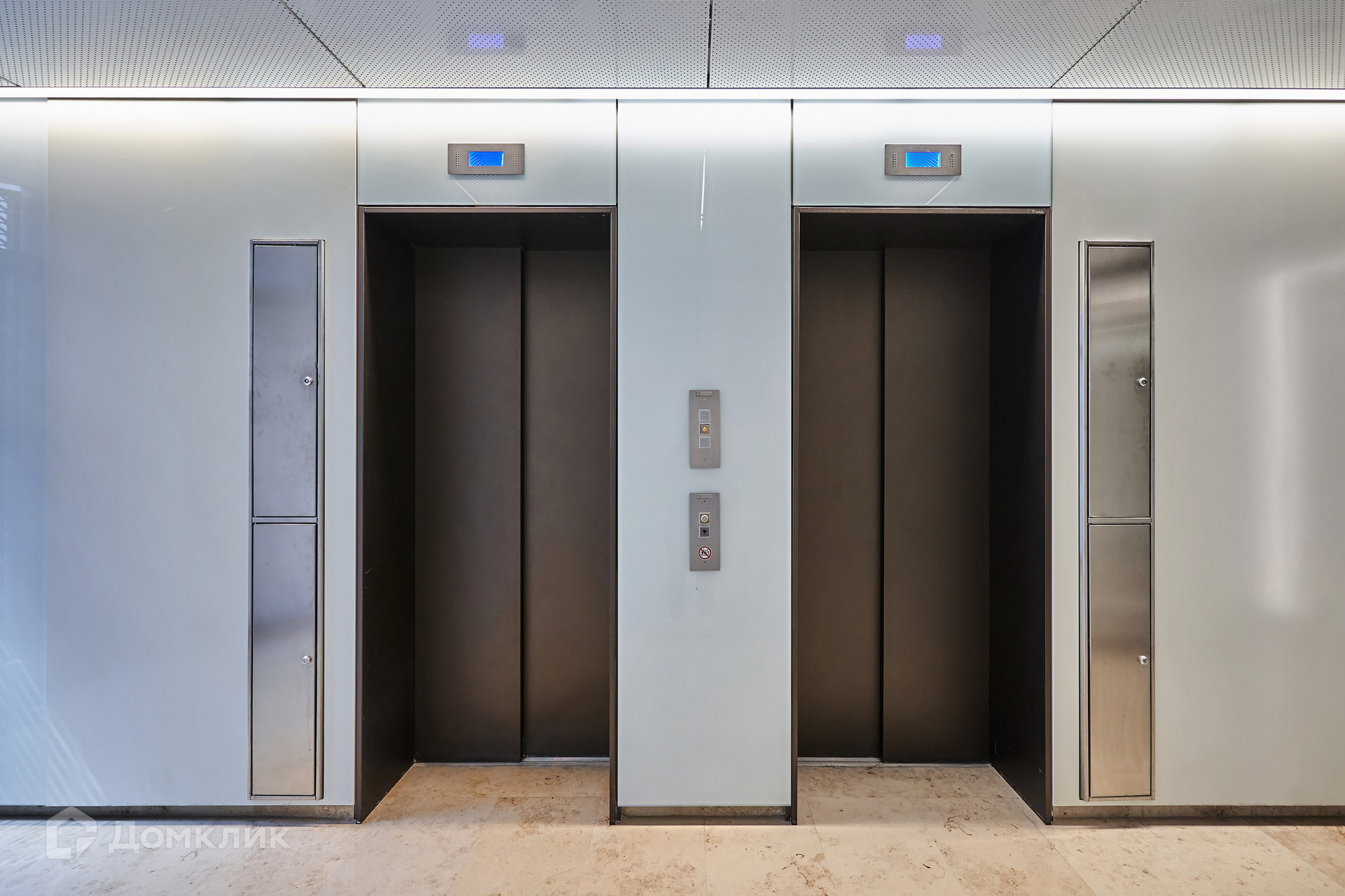 Лобби с отделкой из натурального камня и перфорированного металла выполнено в светлых тонах, украшено витражами.  Для машин предусмотрен подземный двухуровневый паркинг.