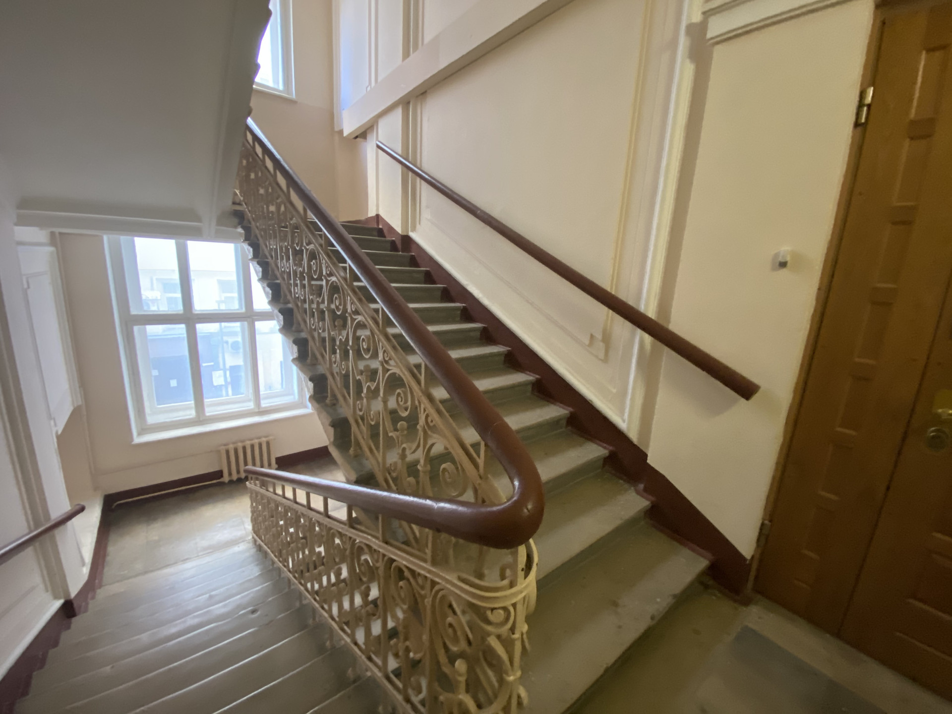 Квартира находится на очень высоком 1 этаже - практически второй. Потолки 3,4 метра - идеально вынести спальное место на антресоль.