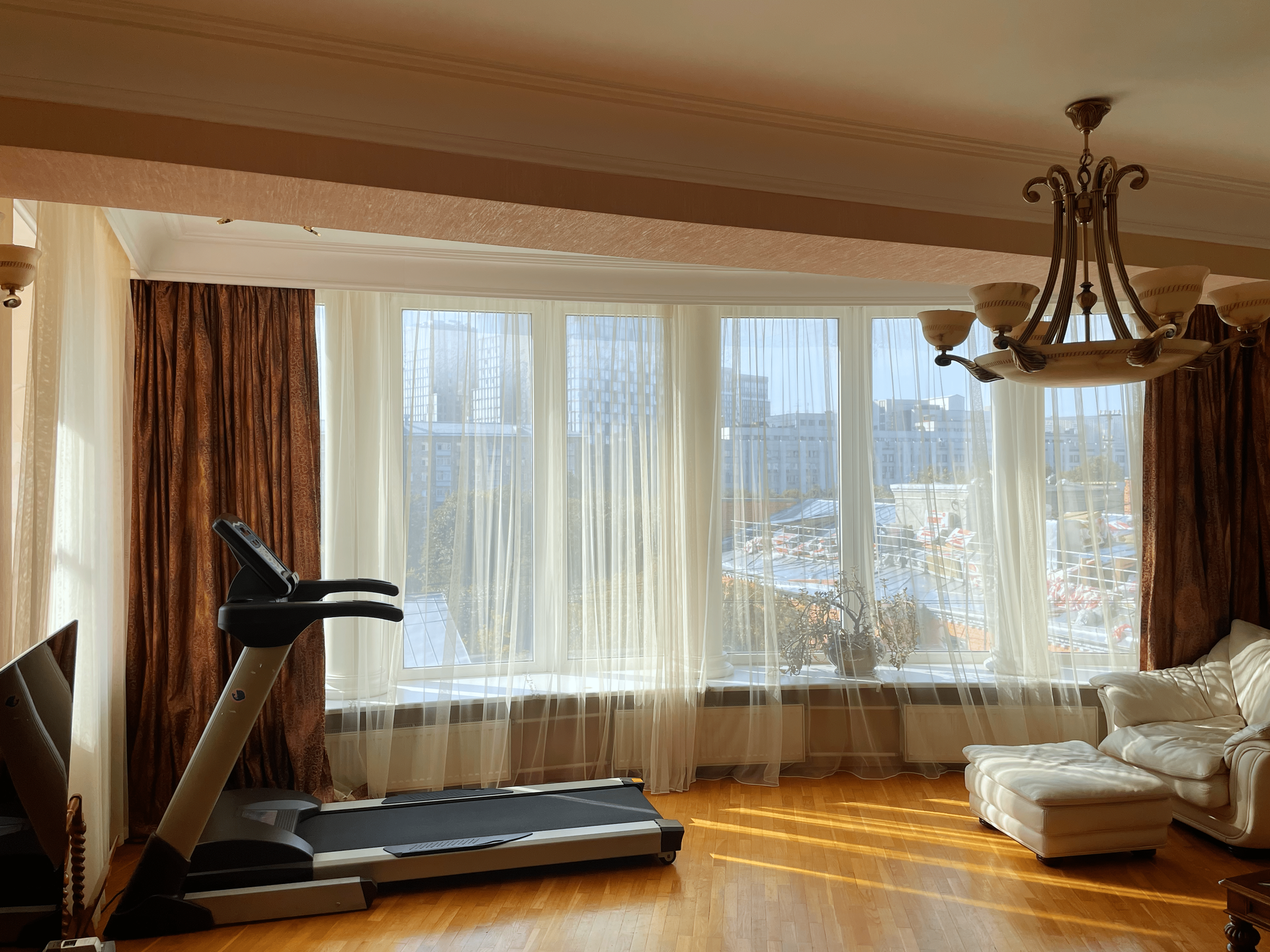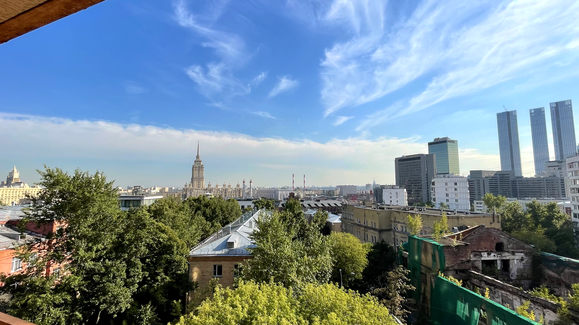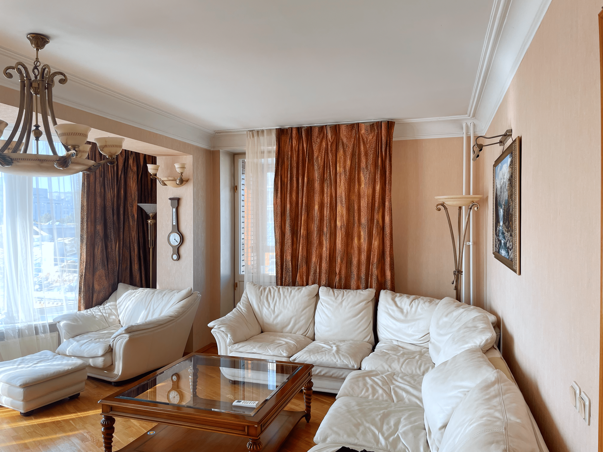 3 спальни и большая гостиная с панорамными окнами на Москву сити. 2 санузла, большая кухня (окна выходят во двор), 2 балкона. Встроенная система кондиционирования, много естественного света, хорошая бытовая техника, мебель остаётся.
