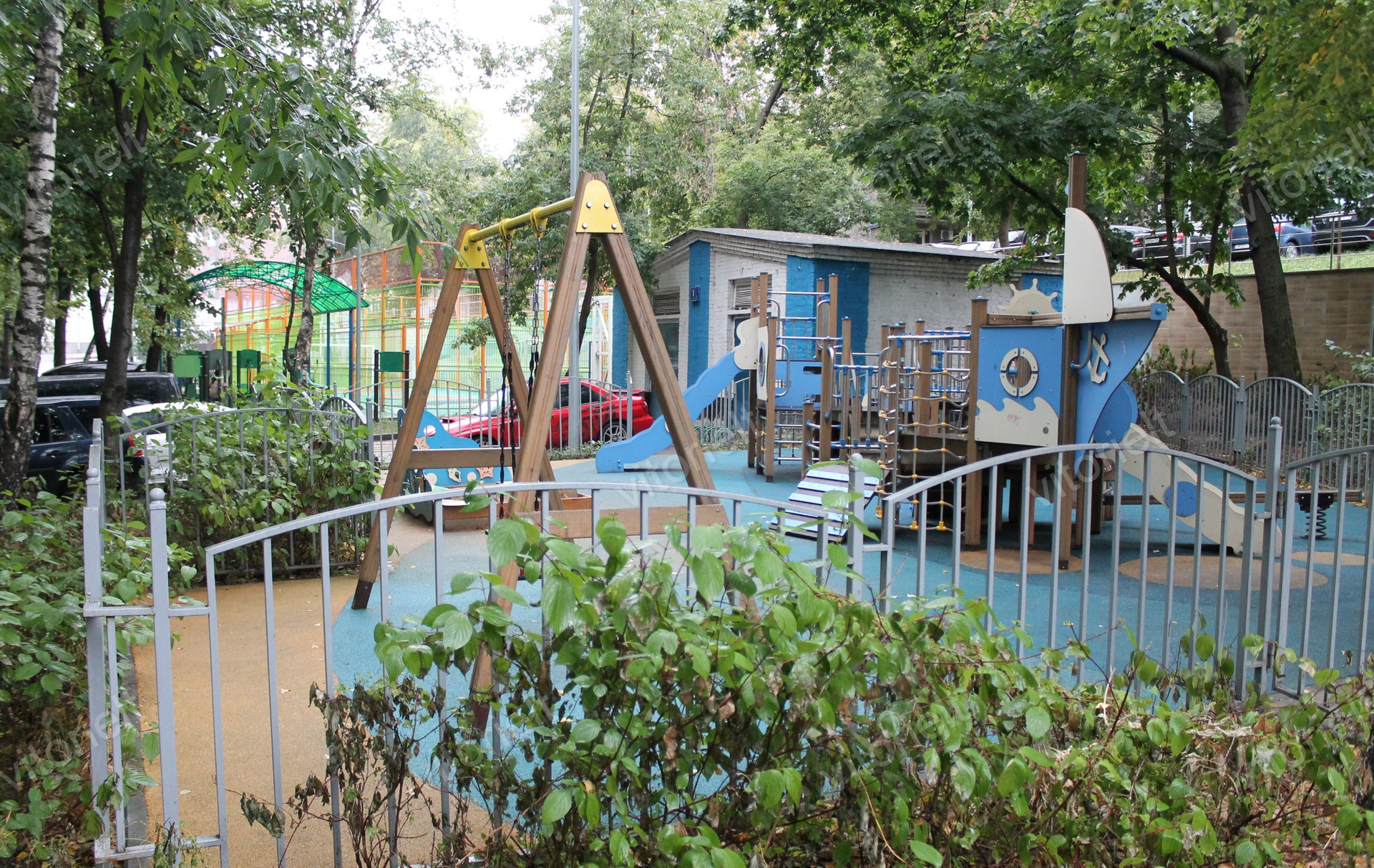 Выход из подъезда во двор, домофон. Двор уютный, тихий, во дворе детская и спортивная площадки.