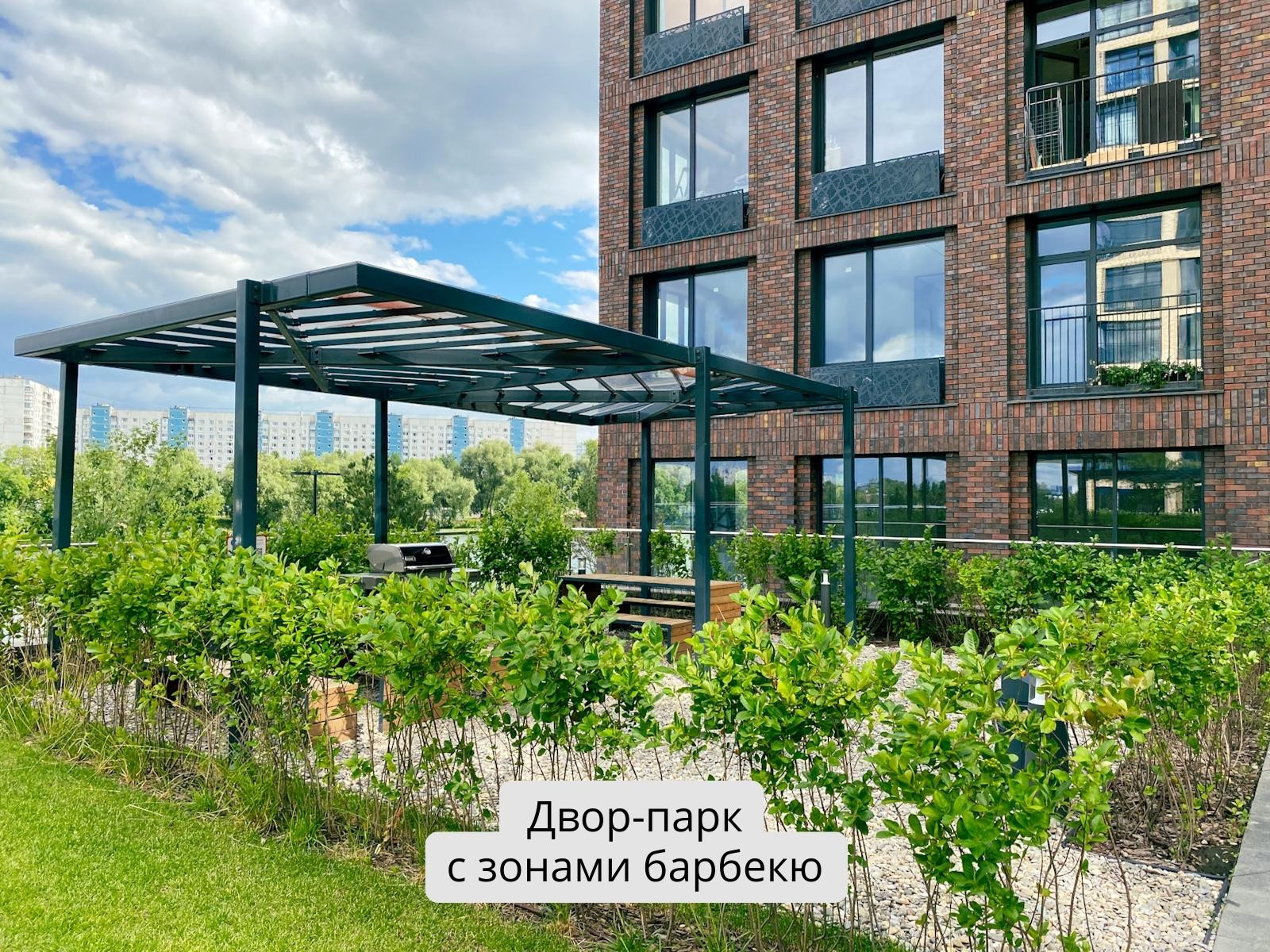Закрытый двор с садом камней, застекленной террасой с шезлонгами и беседками для барбекю?
