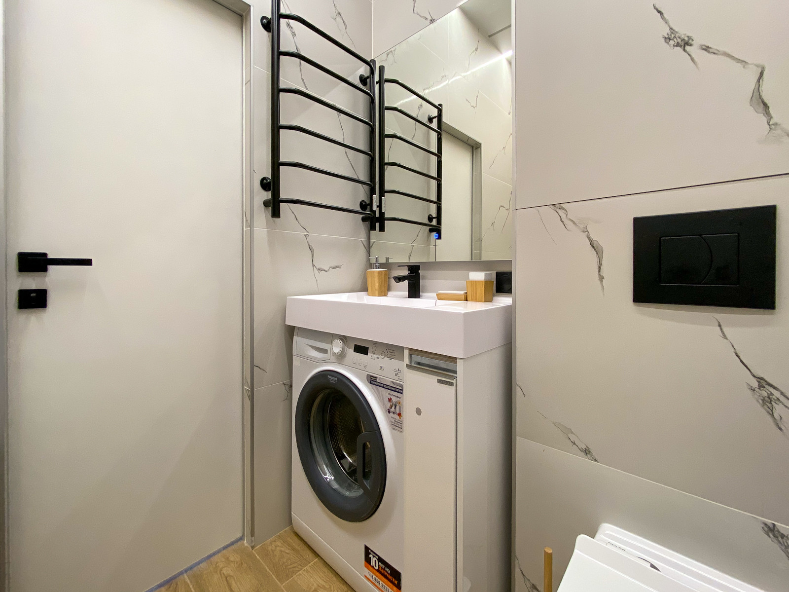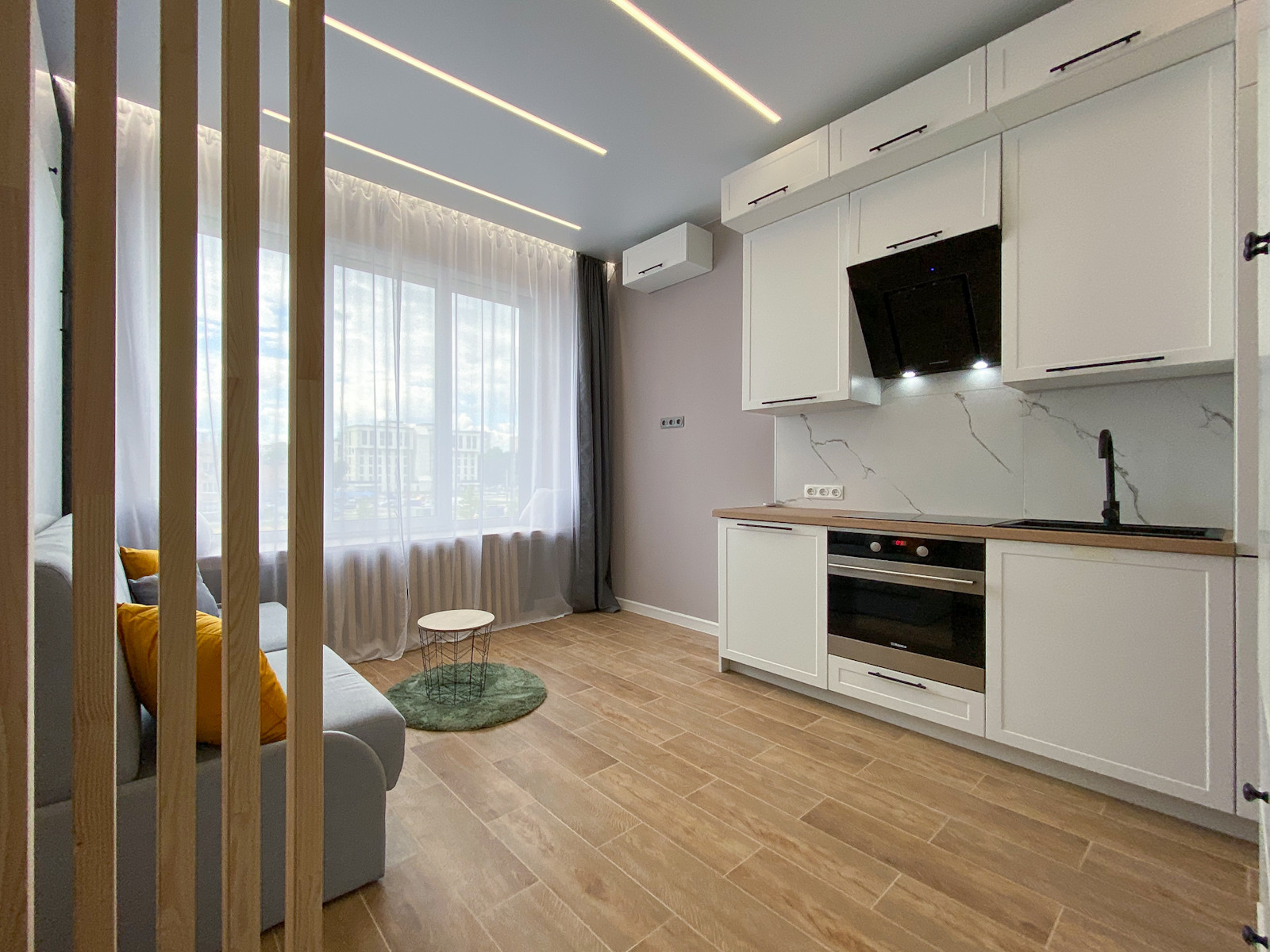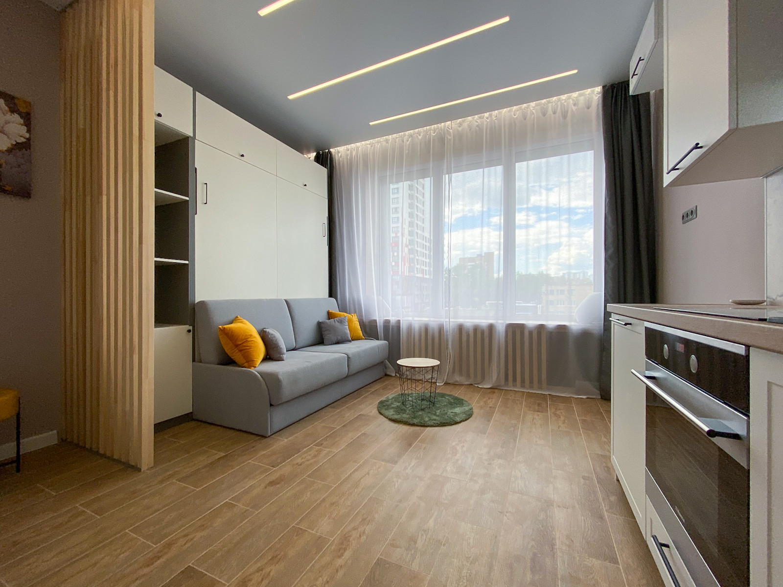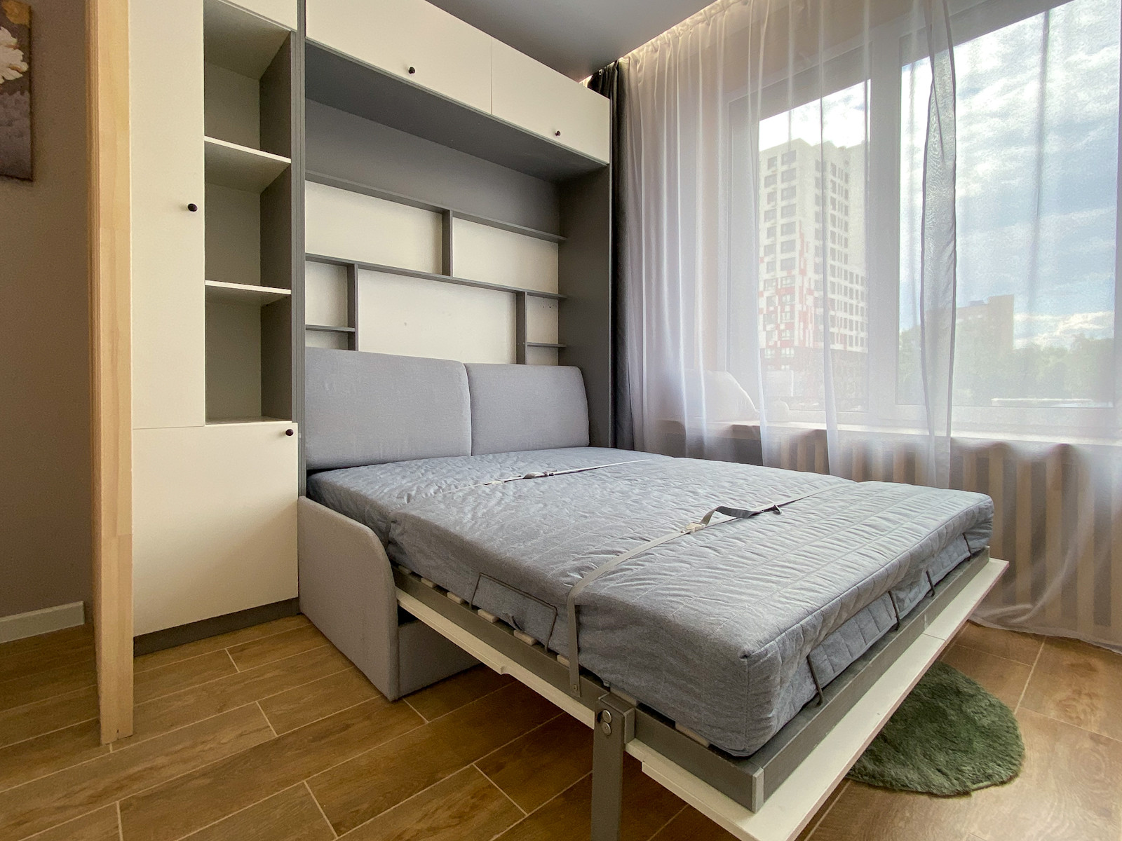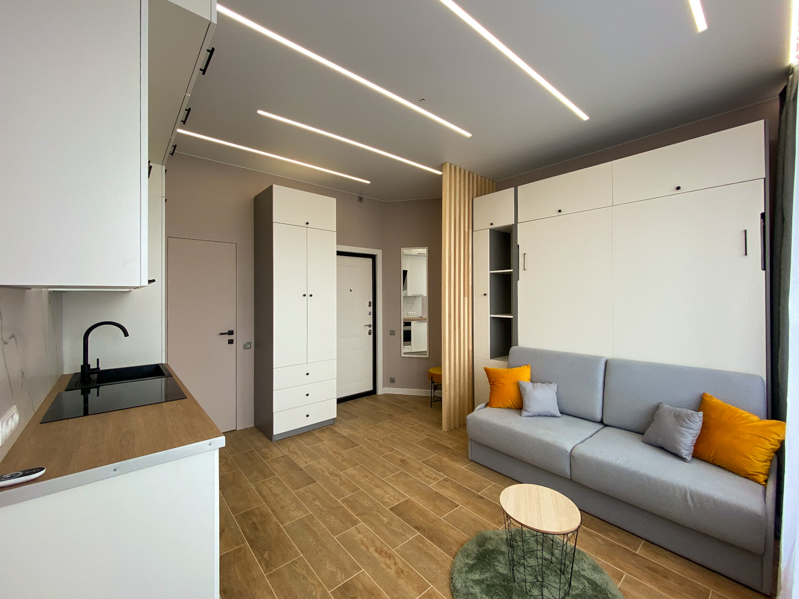 Подходит для сдачи в аренду, в том числе посуточно. Вандалоустойчивые поверхности: керамогранит на полу, стены усилены холстом под покраску. Трансформируемое спальное место и места для хранения.