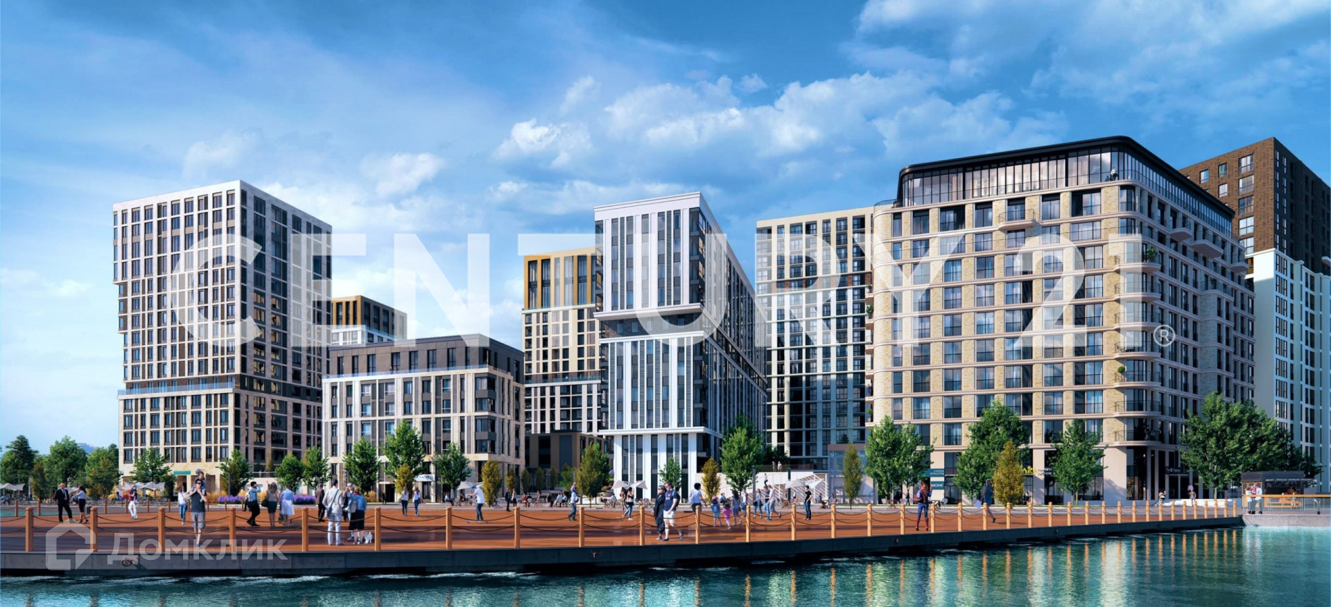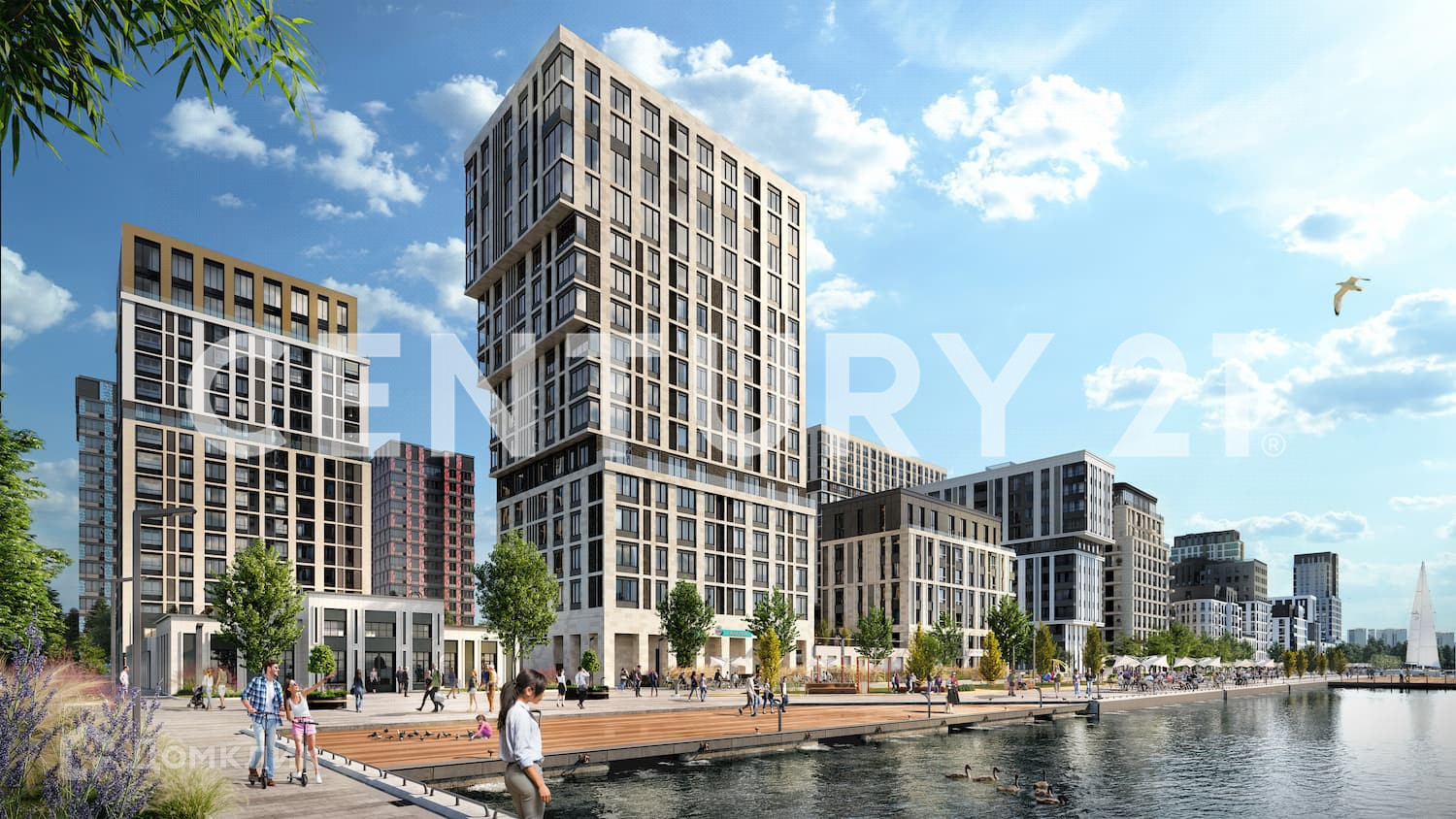Собственная набережная квартала представляет собой образ загородных уикендов: с долгими прогулками и детскими качелями под кронами сосен, с ивами над рекой и яблоневым цветом по весне.