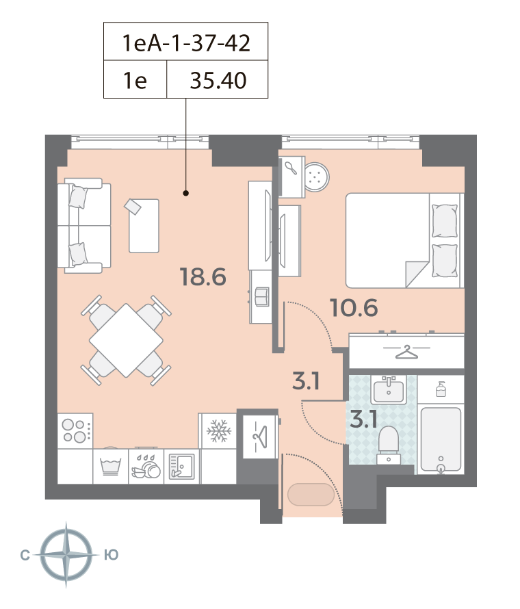 Общая площадь 35.4 м2