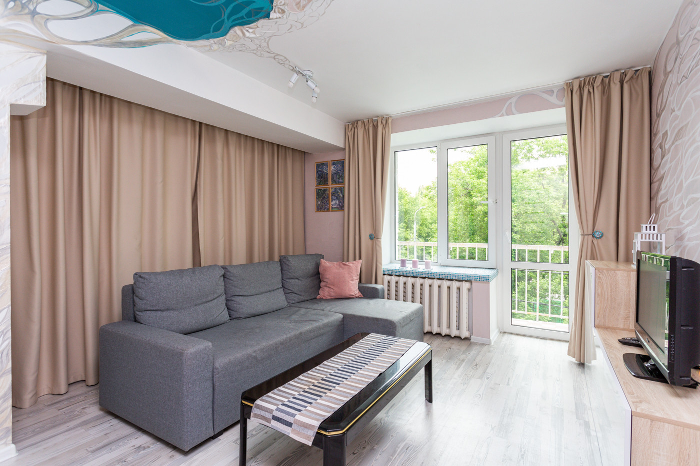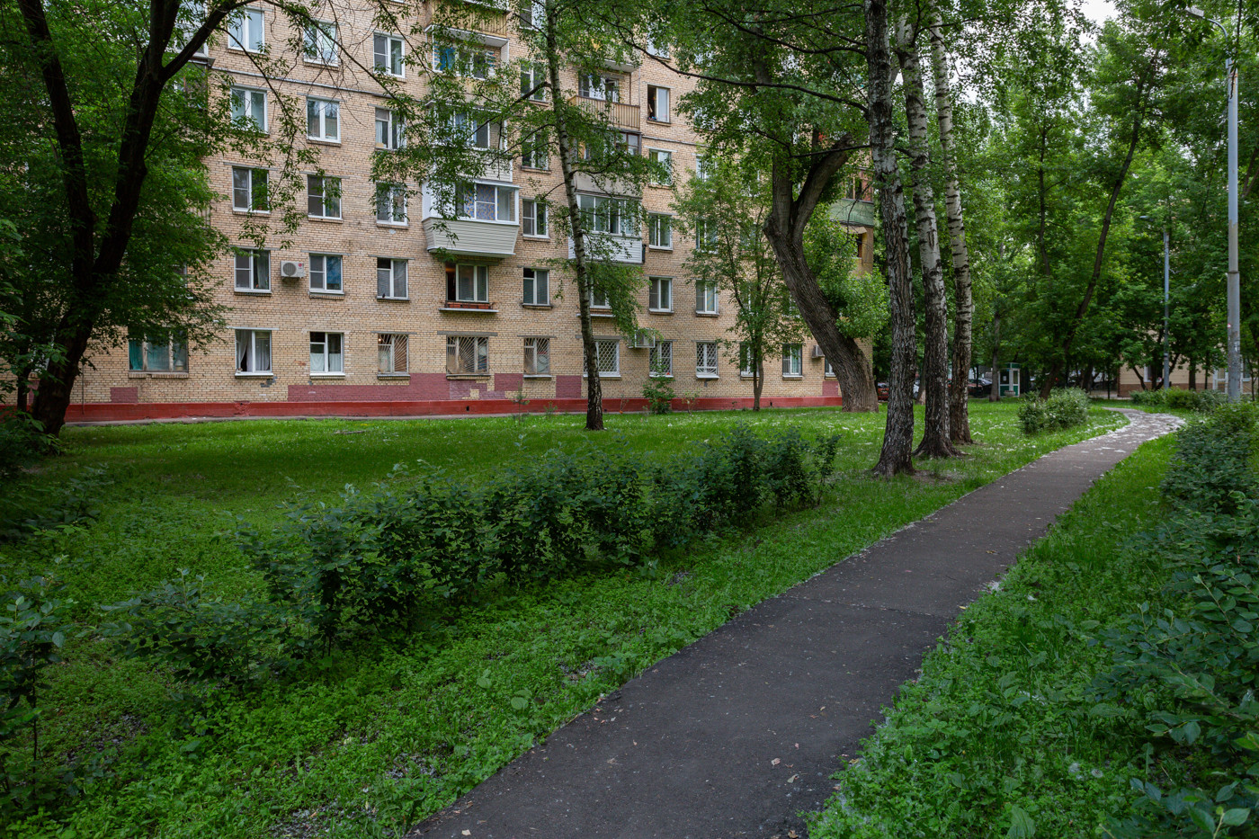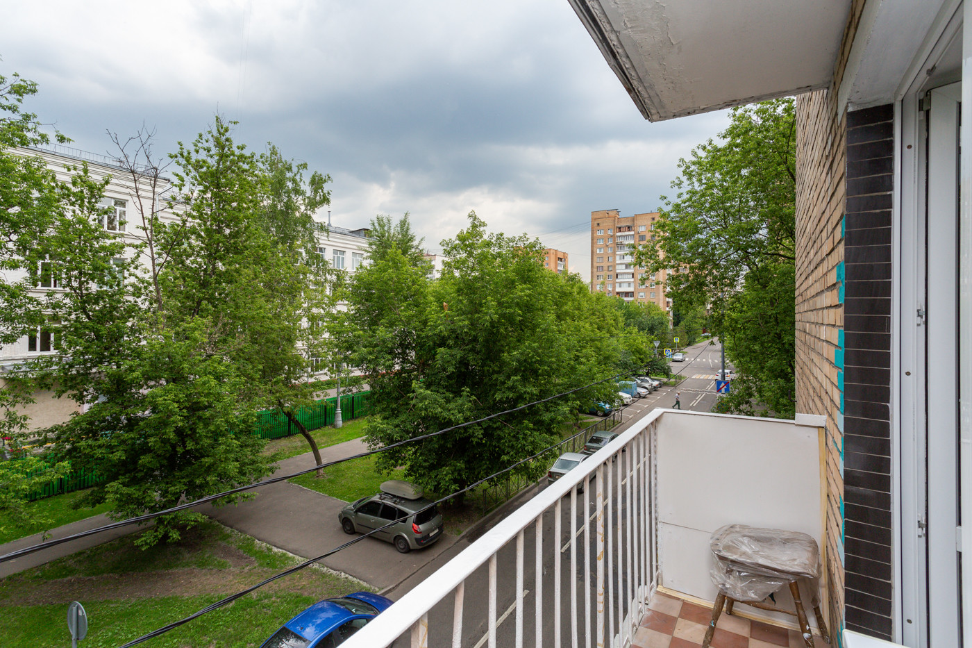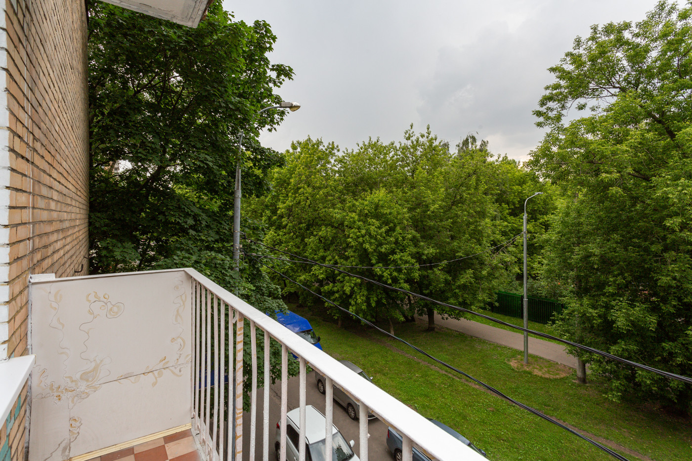 ВНУТРИ. Окна спальни и кухни выходят во двор. В гостиной окно с балконом выходит на тихую зеленую улицу.