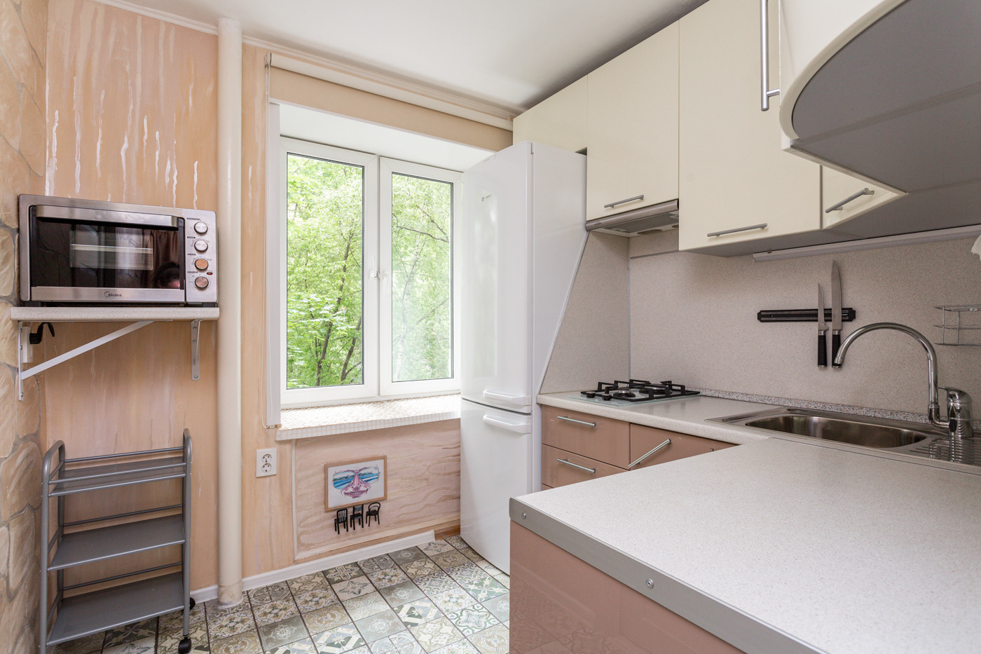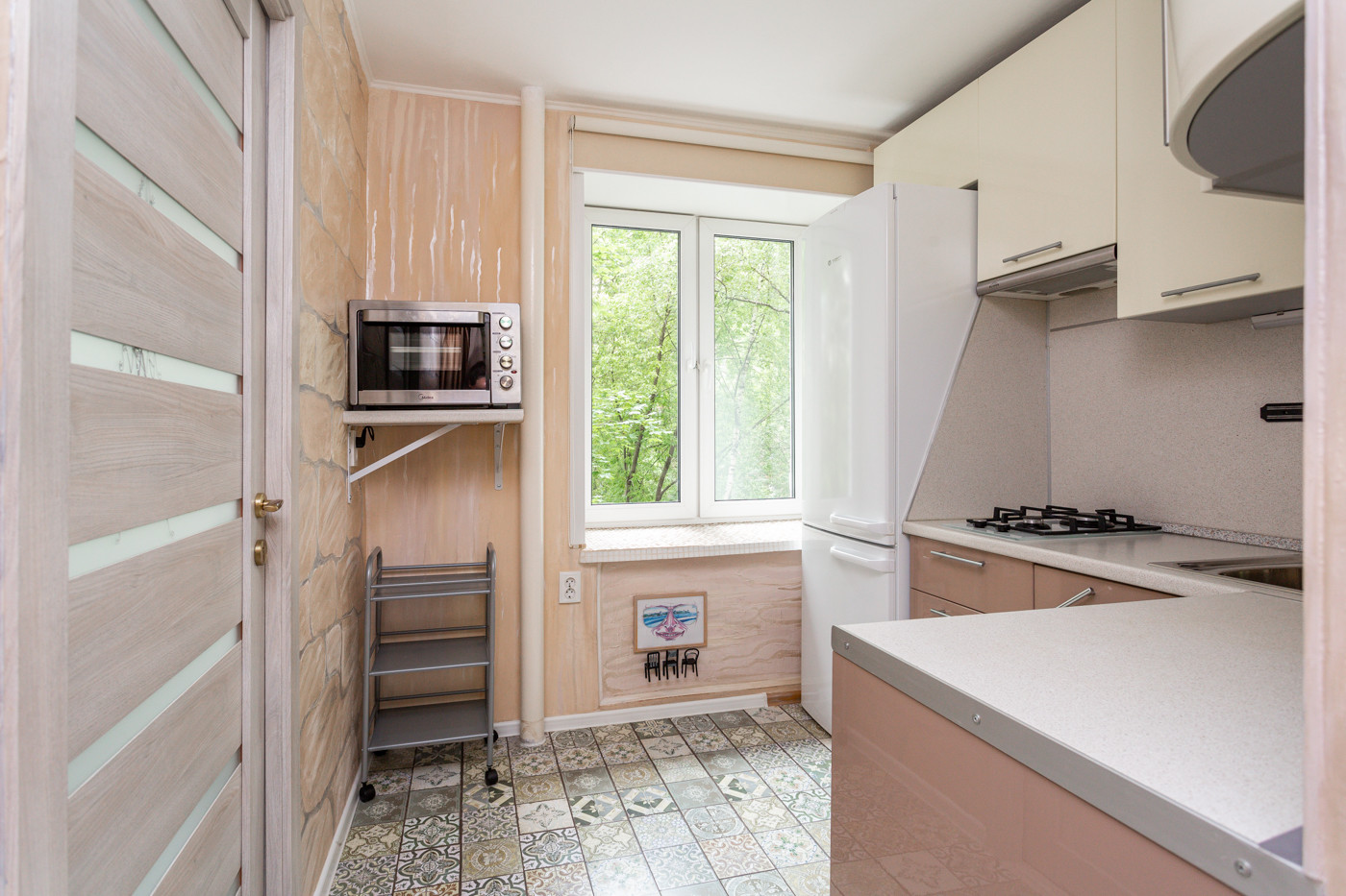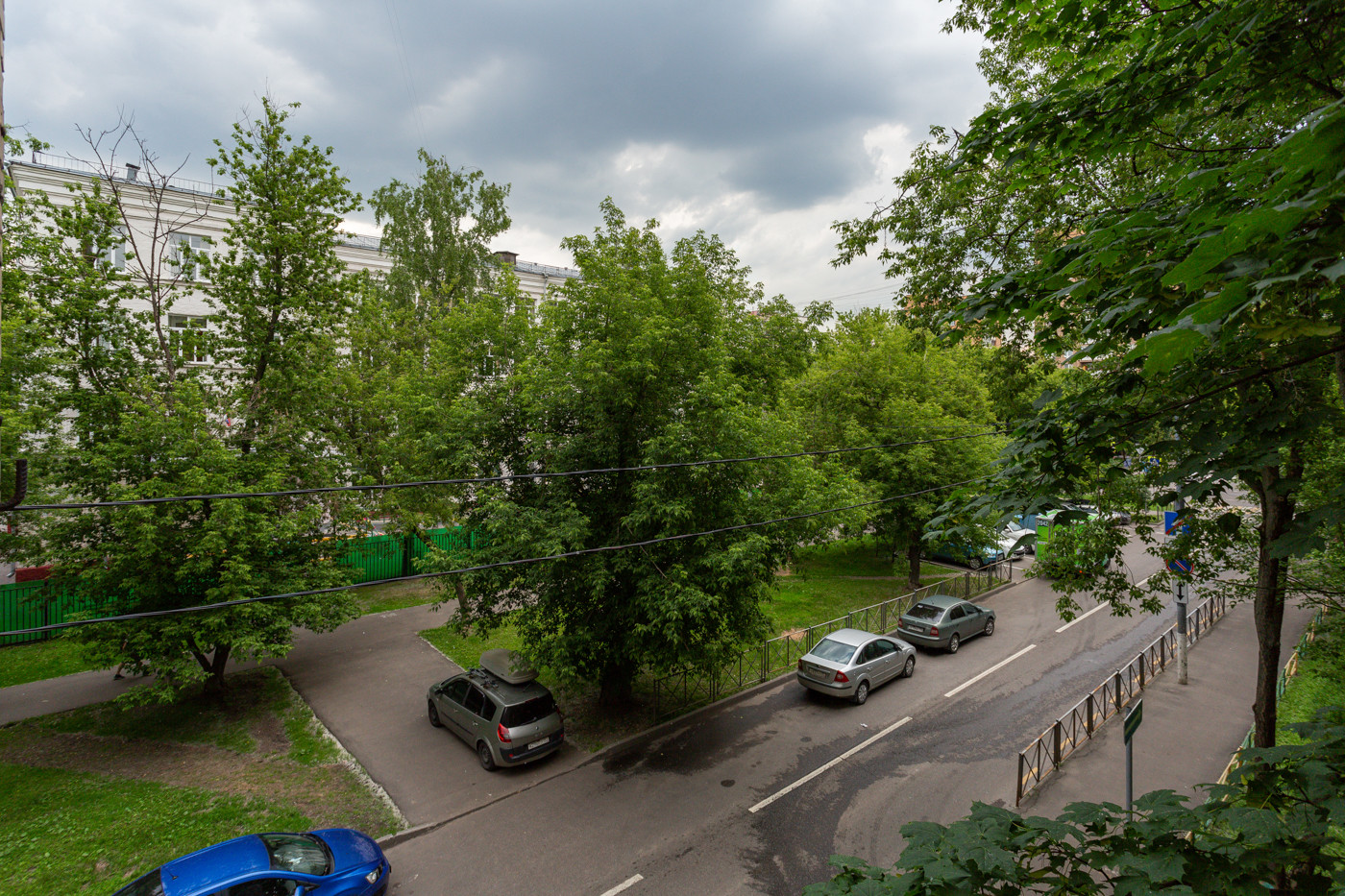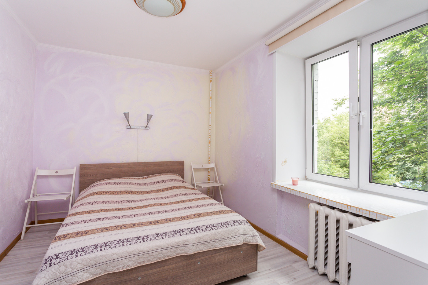ВНУТРИ. Окна спальни и кухни выходят во двор. В гостиной окно с балконом выходит на тихую зеленую улицу.
