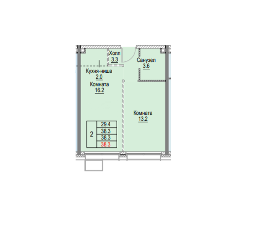 Общая площадь 38.3 м2