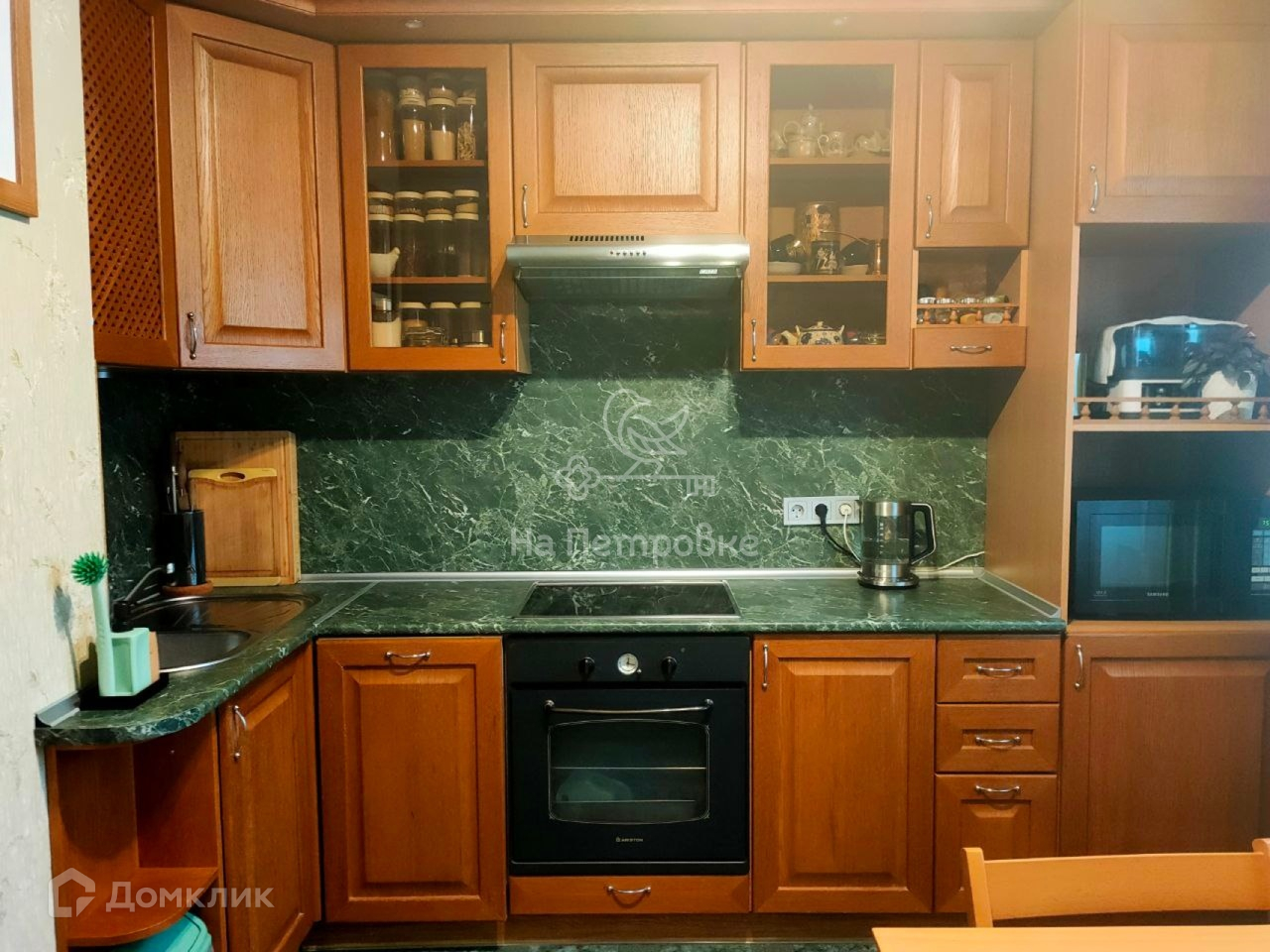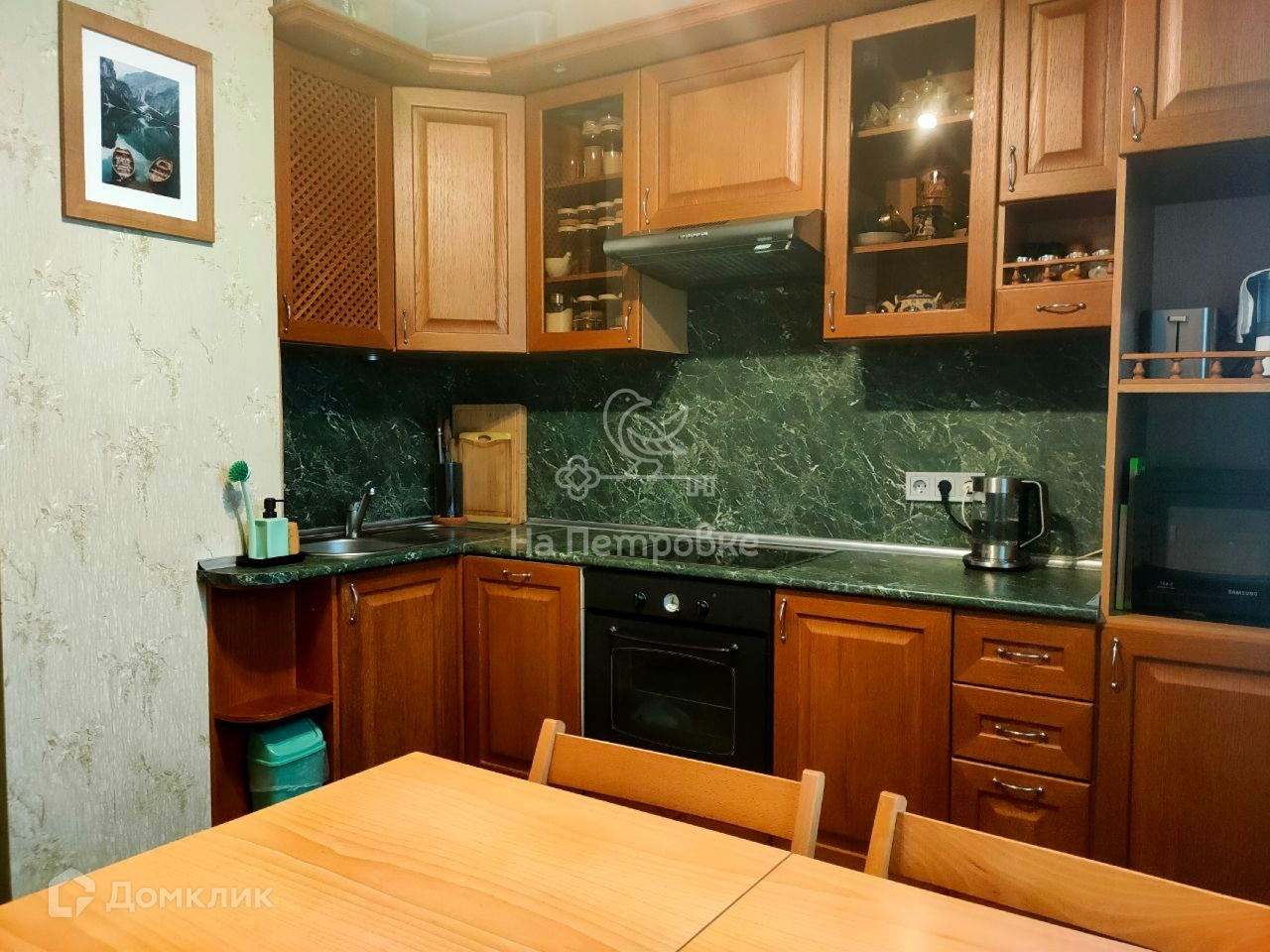 Кухня оборудована гарнитуром, выполненным на заказ с фасадами из шпона дуба, встроенным духовым шкафом и стеклокерамической варочной панелью. Имеется место для посудомоечной машины.