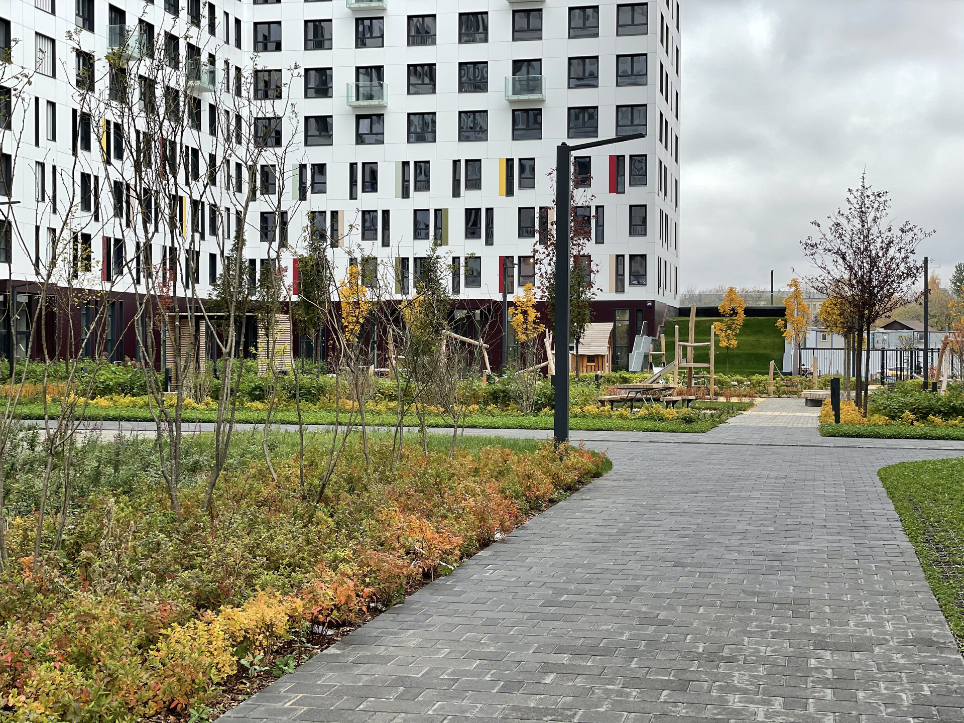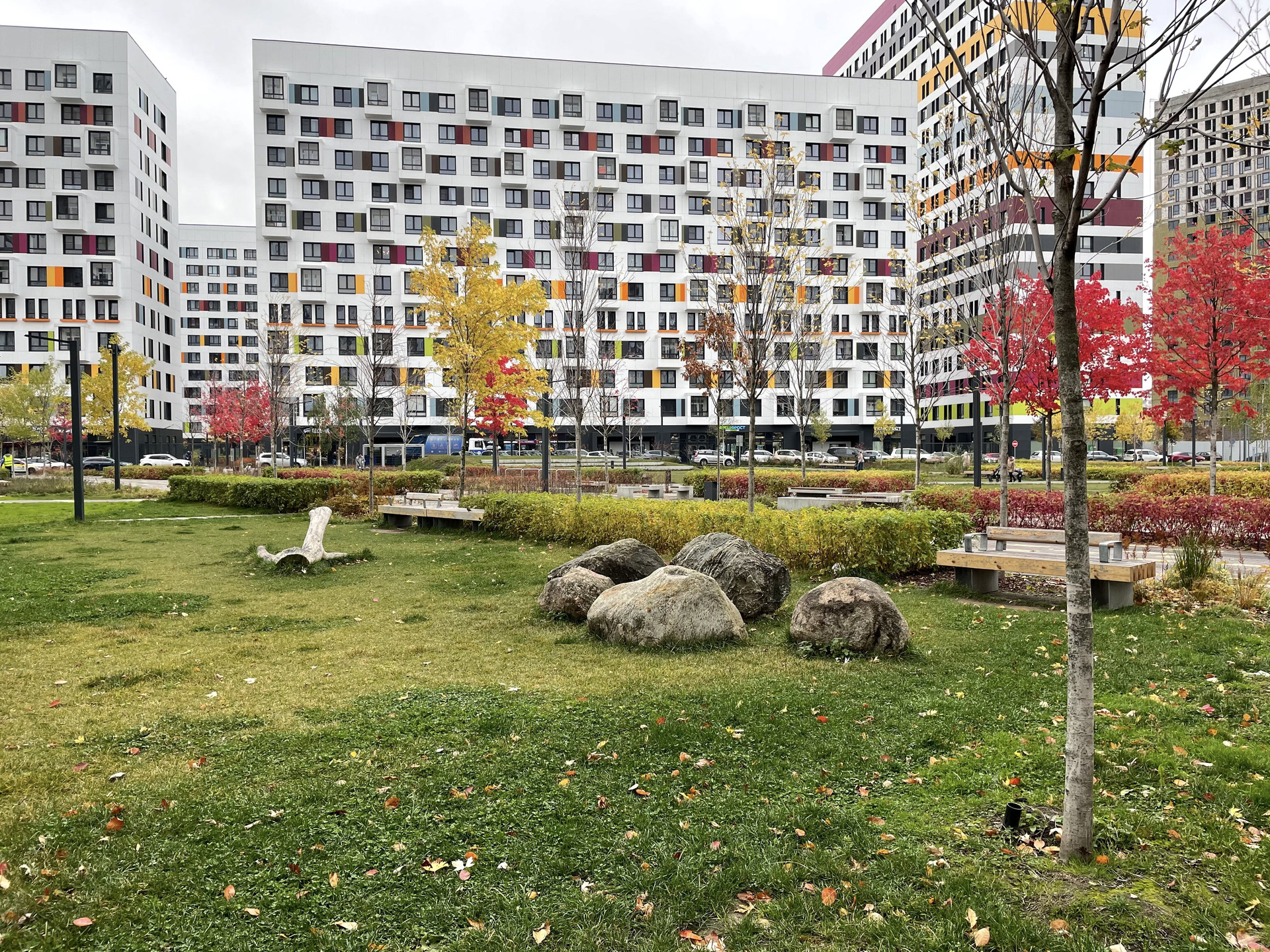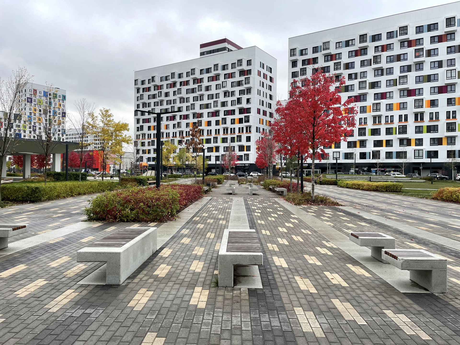 - Свой большой прогулочный парк со скверами, сухими фонтанами и зонами для отдыха