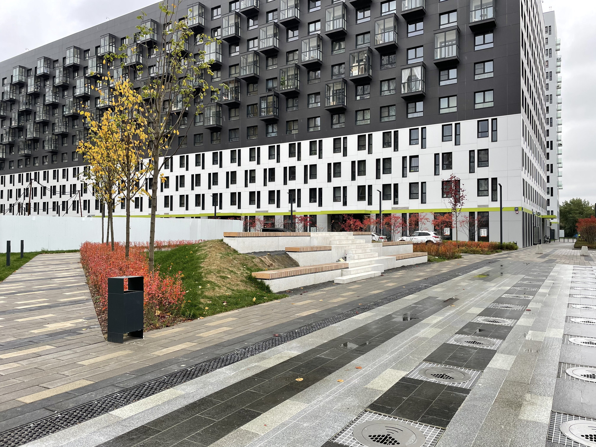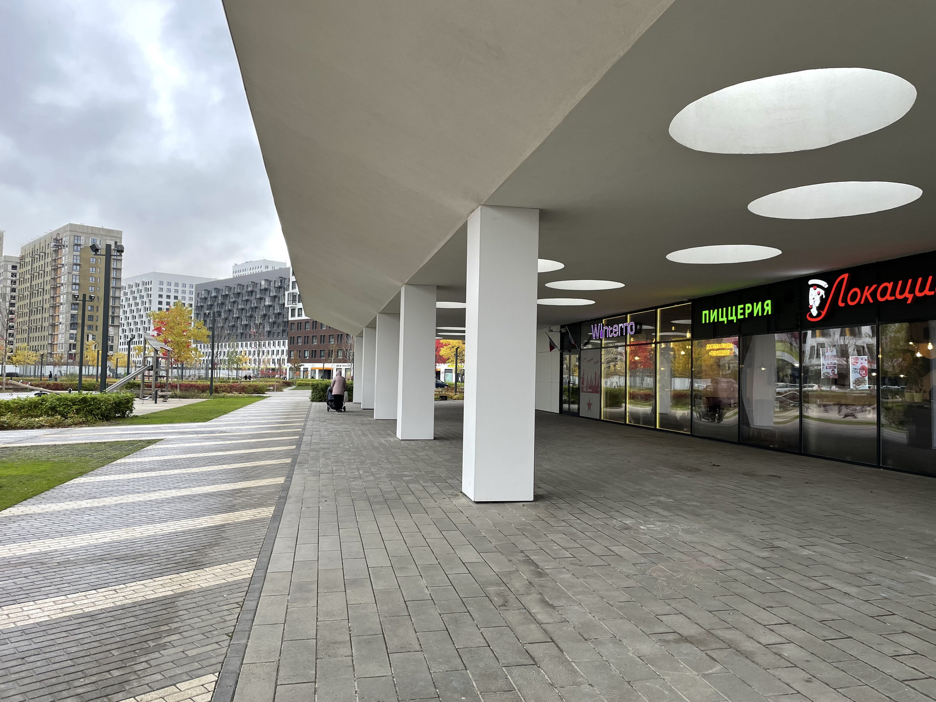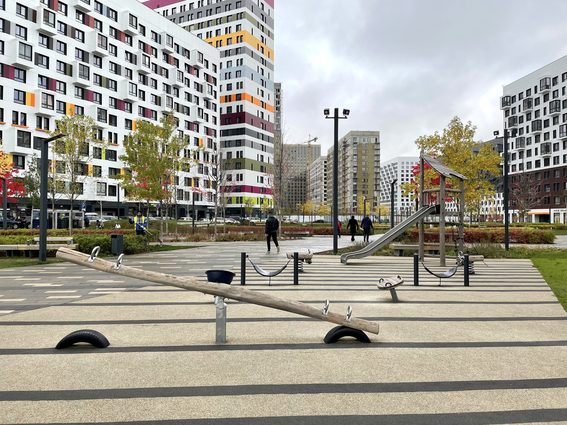 - Свой большой прогулочный парк со скверами, сухими фонтанами и зонами для отдыха