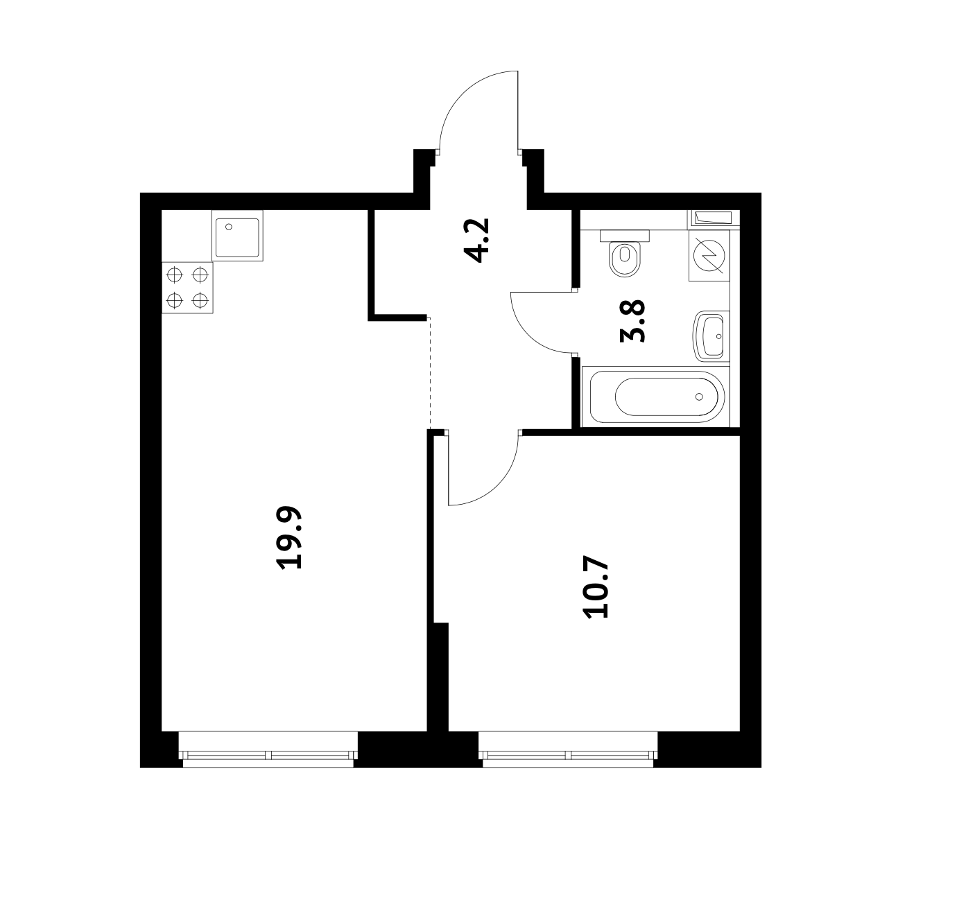 Удобный евро-формат с большой кухней-гостиной и отдельной спальней, который идеально подойдет для одного человека или молодой семьи.