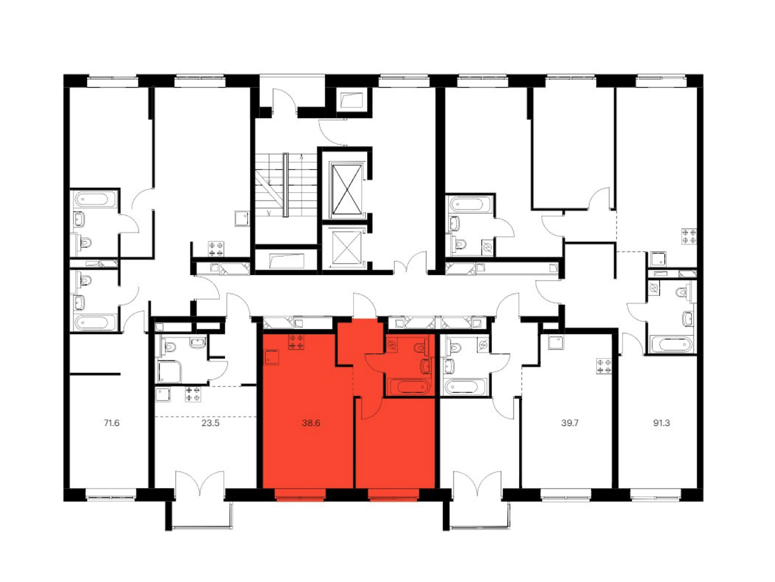 На этаже всего 5 квартир, при этом есть 2 скоростных лифта, один из которых грузопассажирский.