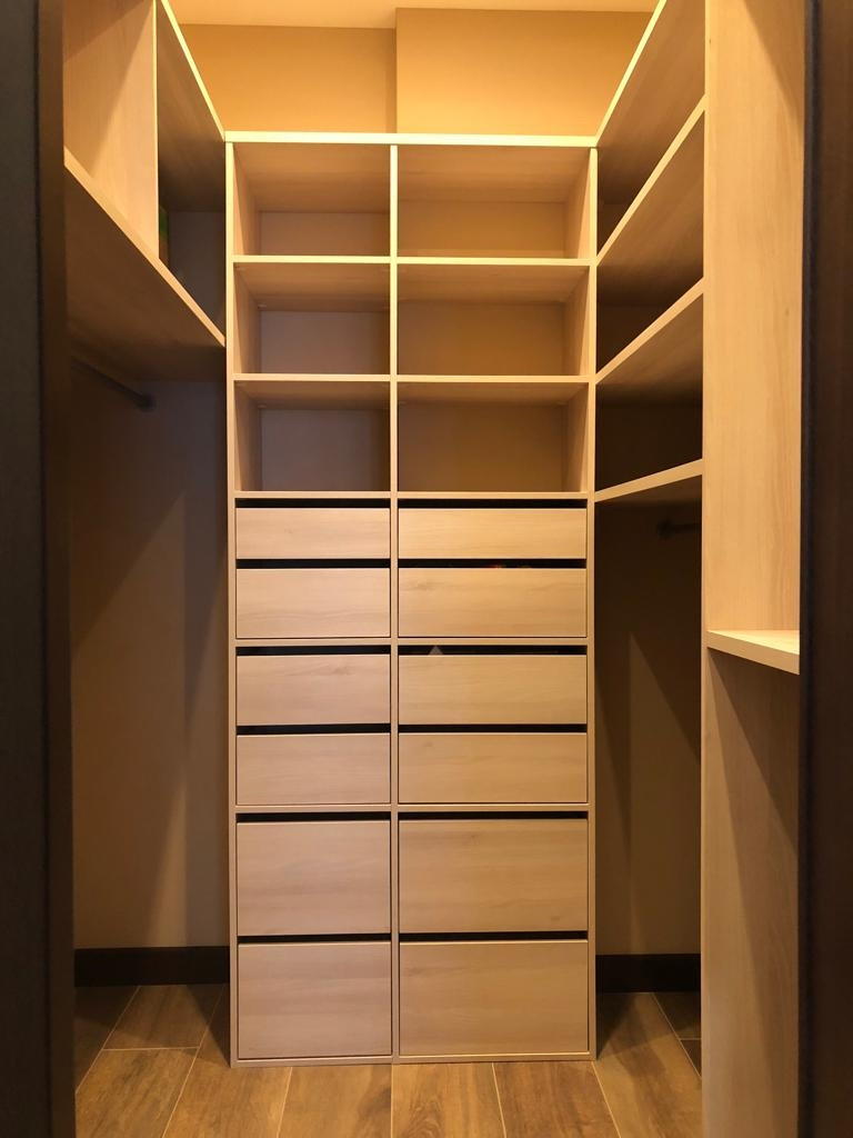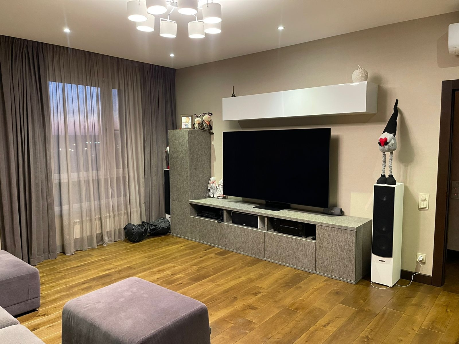 В гостиной - оставляем стенку под тв и диван, так же остаются все встроенные шкафы.
