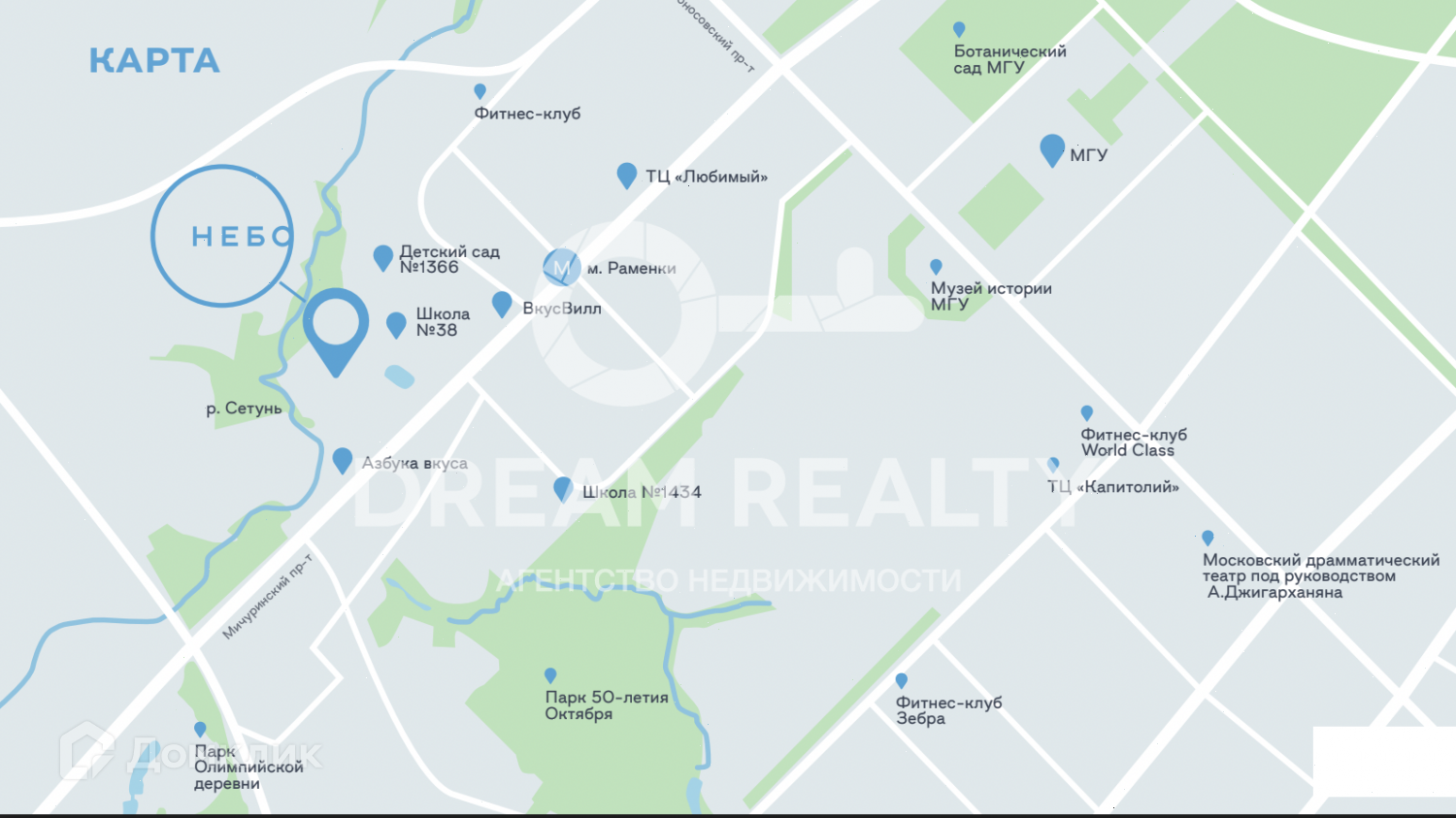 Проект располагается в 10 мин пешком от метро Раменки и в 10 мин пешком от метро Мичуринский проспект, здесь есть пересадка на БКЛ. Рядом с домом МГУ им. М. В. Ломоносова, лучшие школы и дет. сады ЗАО, киностудия «Мосфильм», ландшафтный заказник «Долина реки Раменки», площадью более 32 га, а также Природный заказник «Воробьевы горы» и Ботанический сад МГУ.