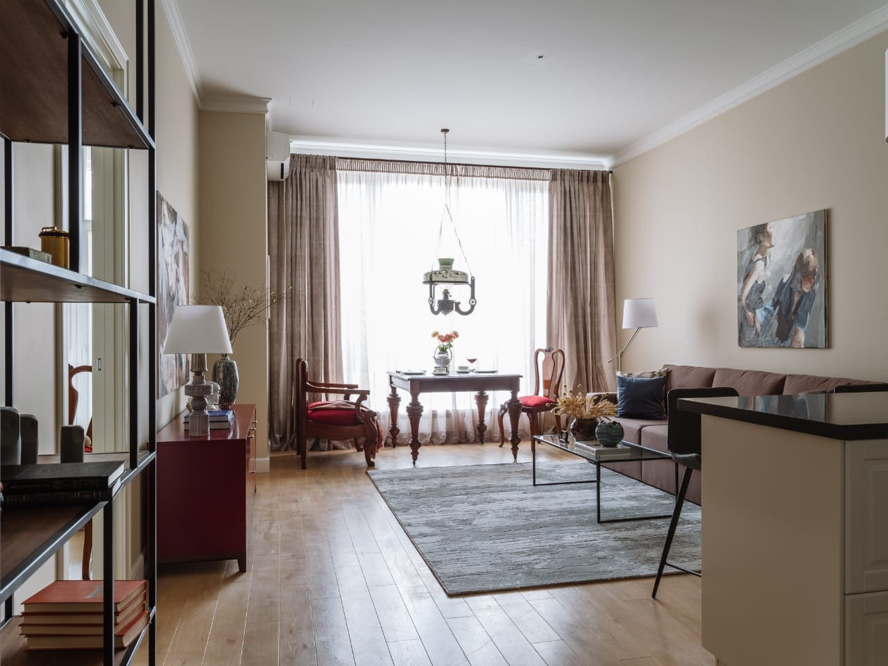 Кухня-гостиная и спальня выполнены в классическом стиле. Вместительная гардеробная.