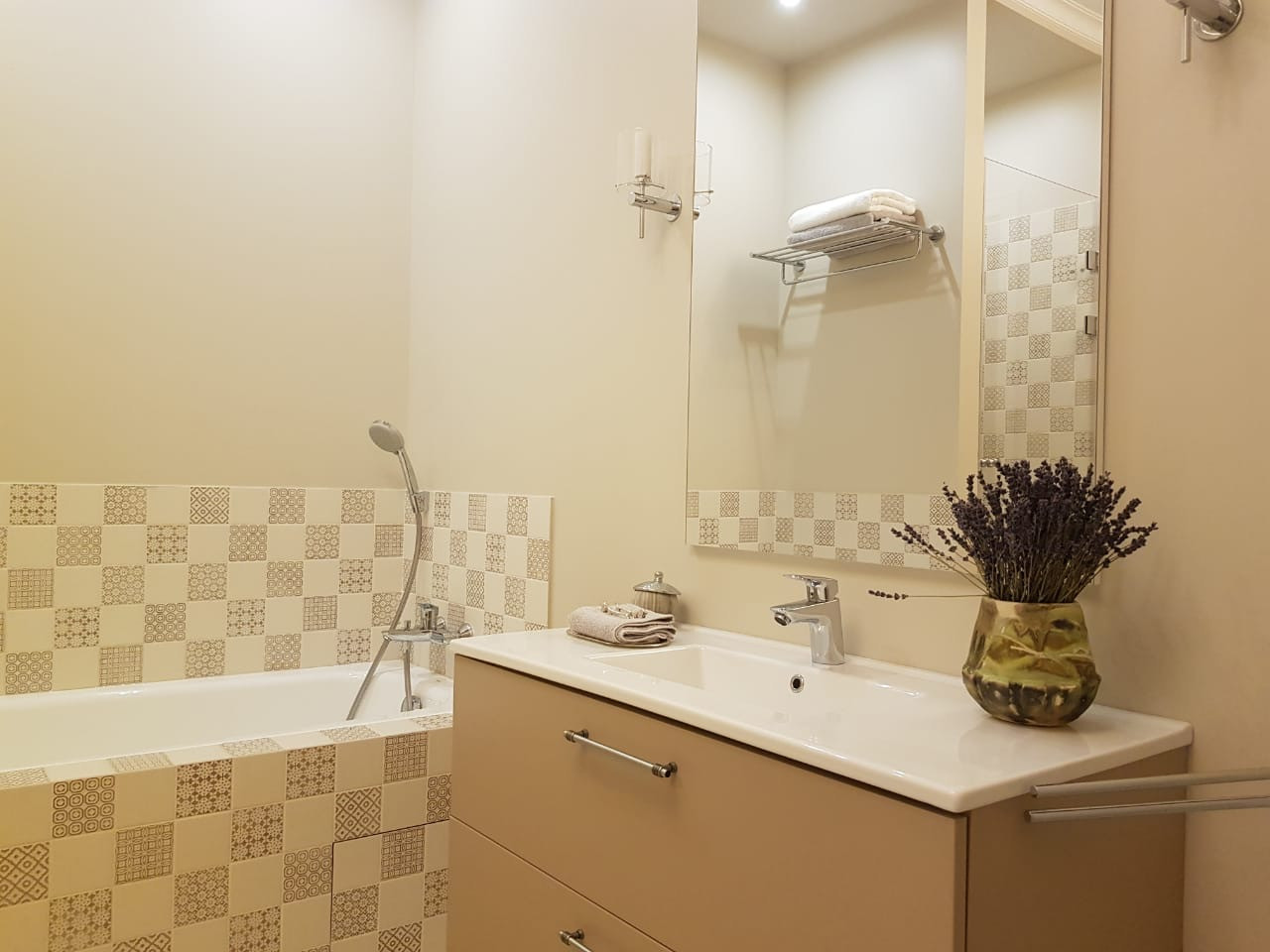 Санузел с ванной и душевой кабиной.