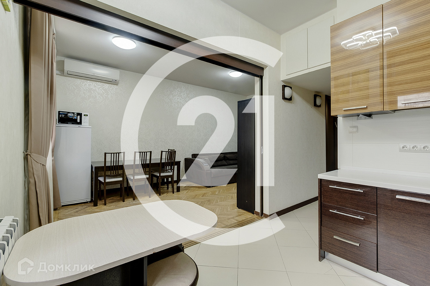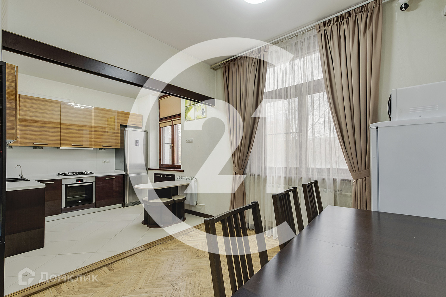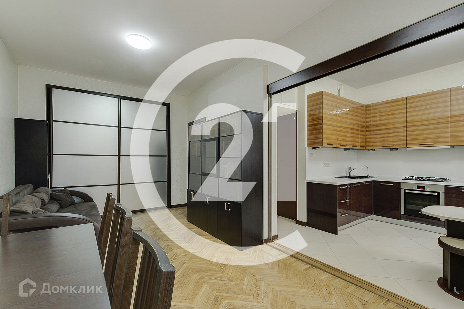 В левой части квартиры расположена уютная светлая кухня 8,4 кв.м, которая соединена раздвижной перегородкой с просторной гостиной, площадью 20.6 кв.м. Окна во двор, на восточную часть света. Оставляем в подарок кухонный гарнитур со встроенной техникой.