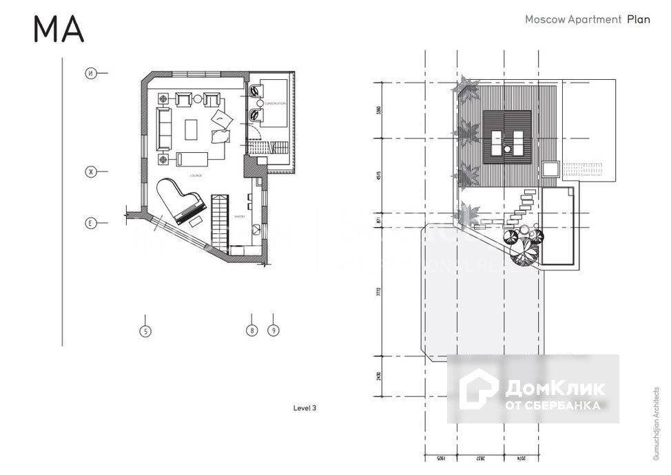 Третий уровень: просторная гостиная с панорамными окнами, стеклянным потолком и выходом на видовую террасу. Из зоны террасы ведет лестница на эксплуатируемую кровлю. Кровля входит в официальную площадь пентхауса.