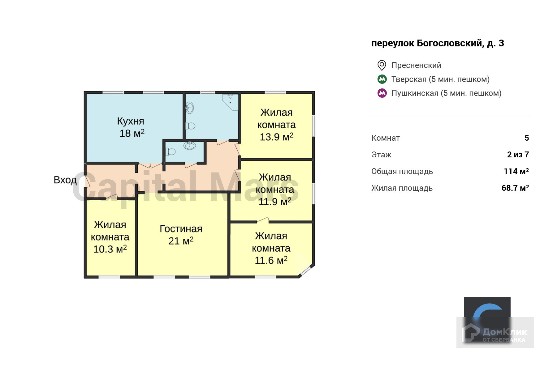 5-комнатная квартира, 114 м2, этаж 2 / 7, на продажу в Москве, Богословский переулок, 3