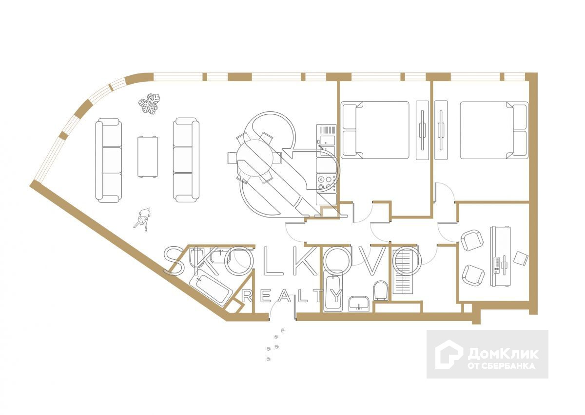 В квартире удобная планировка: 2 мастер-спальни с гардеробными и санузлами, просторная кухня, объединенная с гостиной, прихожая, гостевой санузел. Так как квартира в бетоне, планировку будет возможно изменить.