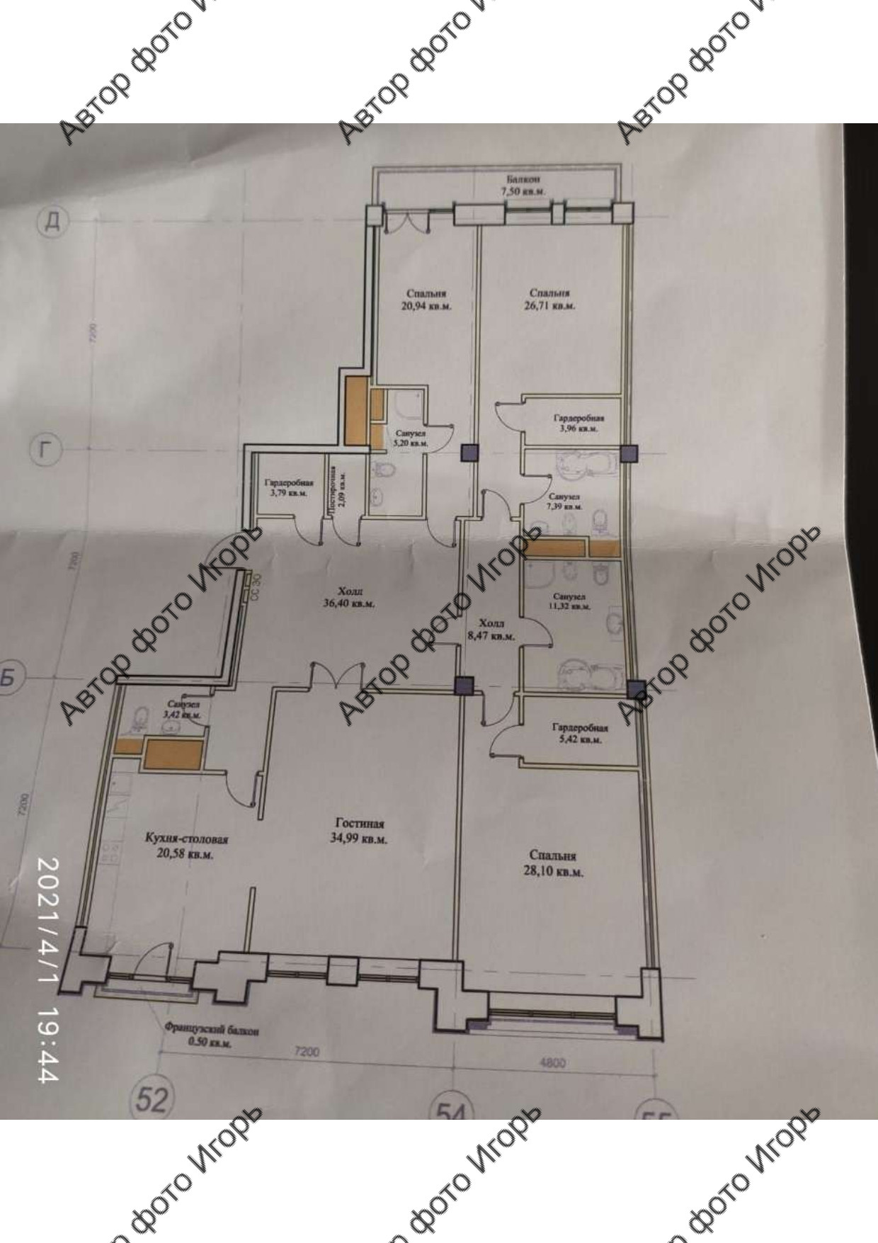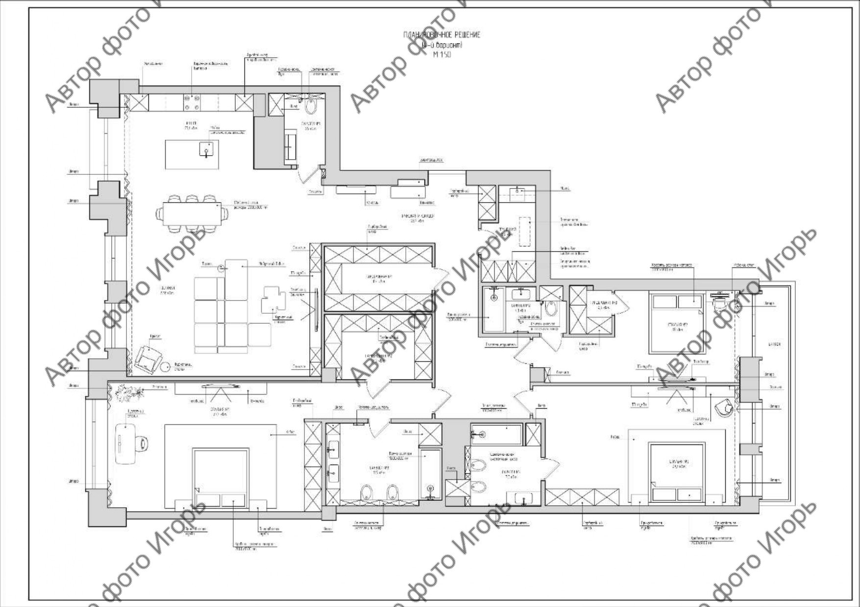 В настоящее время в квартире идет чистовая отделка согласно планировке: 3 спальни, каждая с гардеробной и санузлом; гостиная , объединенная с кухней с санузлом.