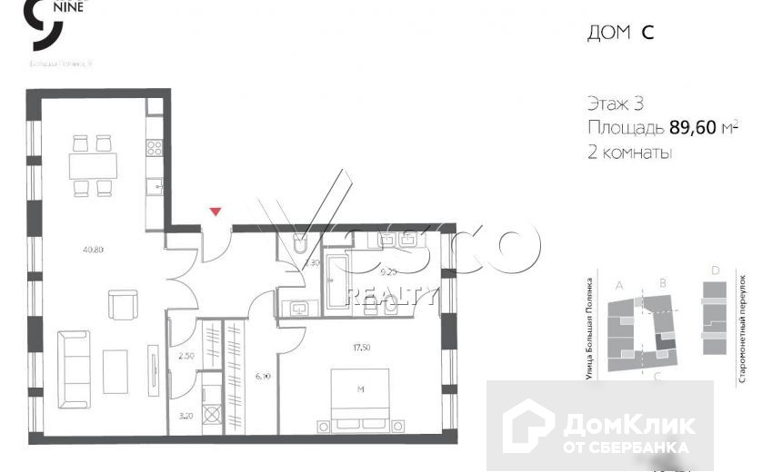 2-комнатная квартира, 92.5 м2, этаж 3 / 6, на продажу в Москве, улица Большая Полянка, 9