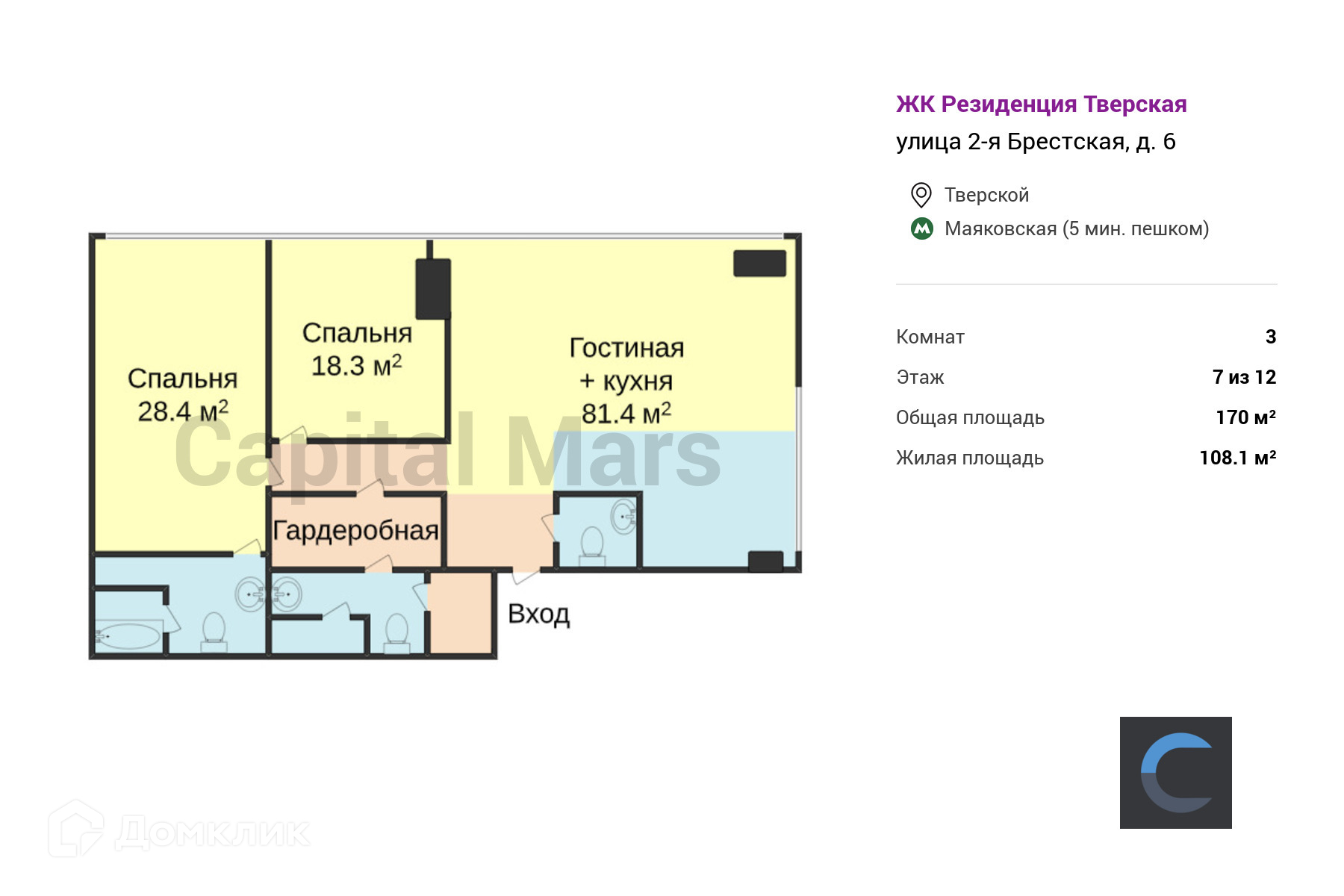 3-комнатная квартира, 170 м2, этаж 7 / 12, на продажу в Москве, 2-я Брестская улица, 6
