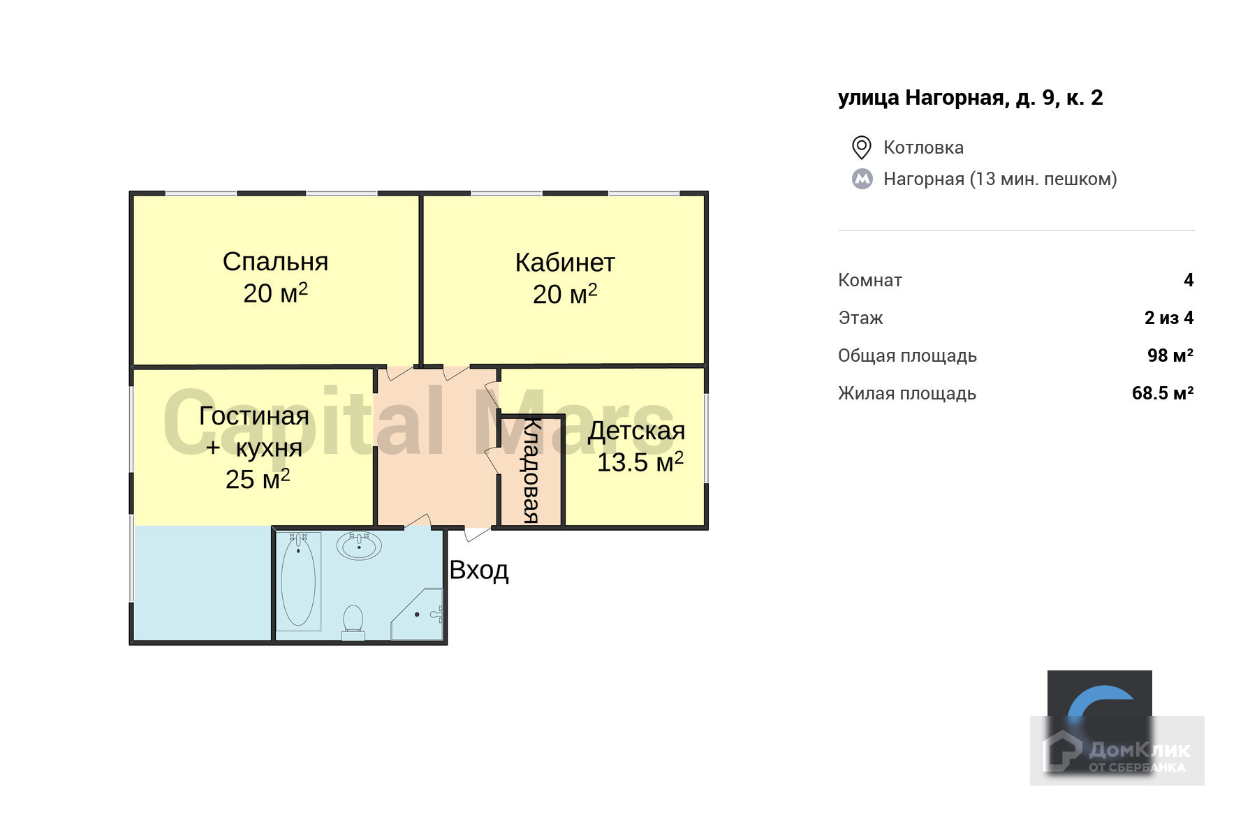 4-комнатная квартира, 98 м2, этаж 2 / 4, на продажу в Москве, Нагорная улица, 9к2