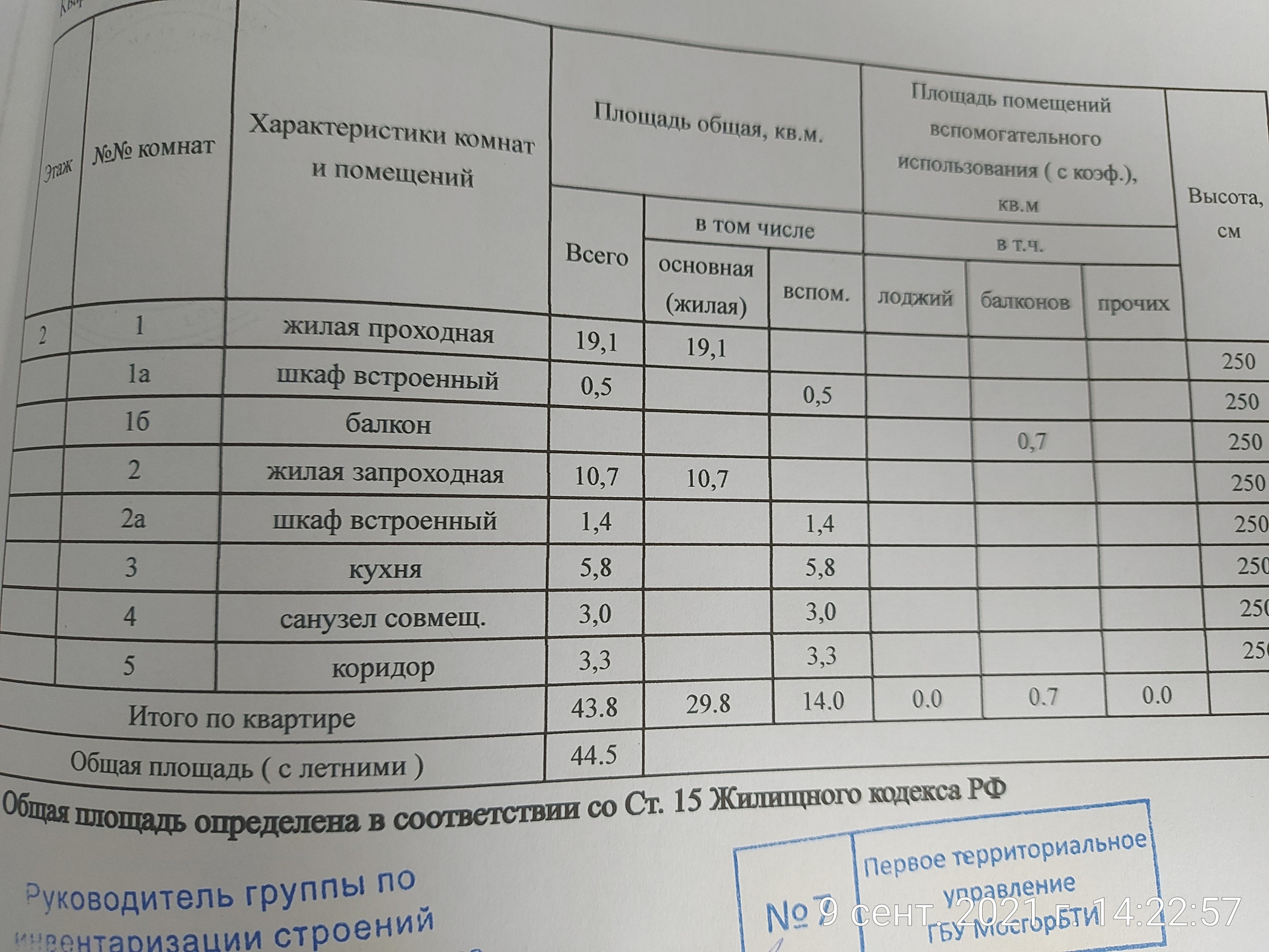 Общая площадь 44.5 м2