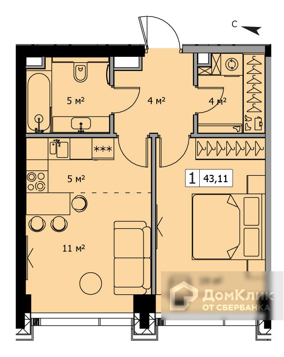 Общая площадь 43.34 м2