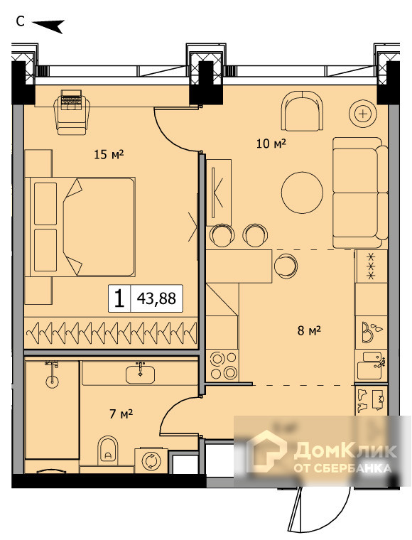 Общая площадь 43.5 м2
