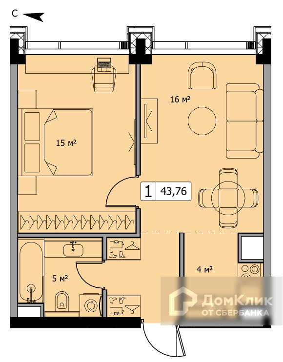 Общая площадь 43.4 м2