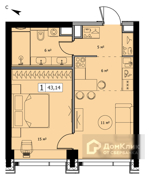 Общая площадь 42.77 м2