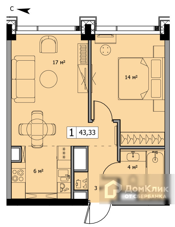 Общая площадь 43.36 м2