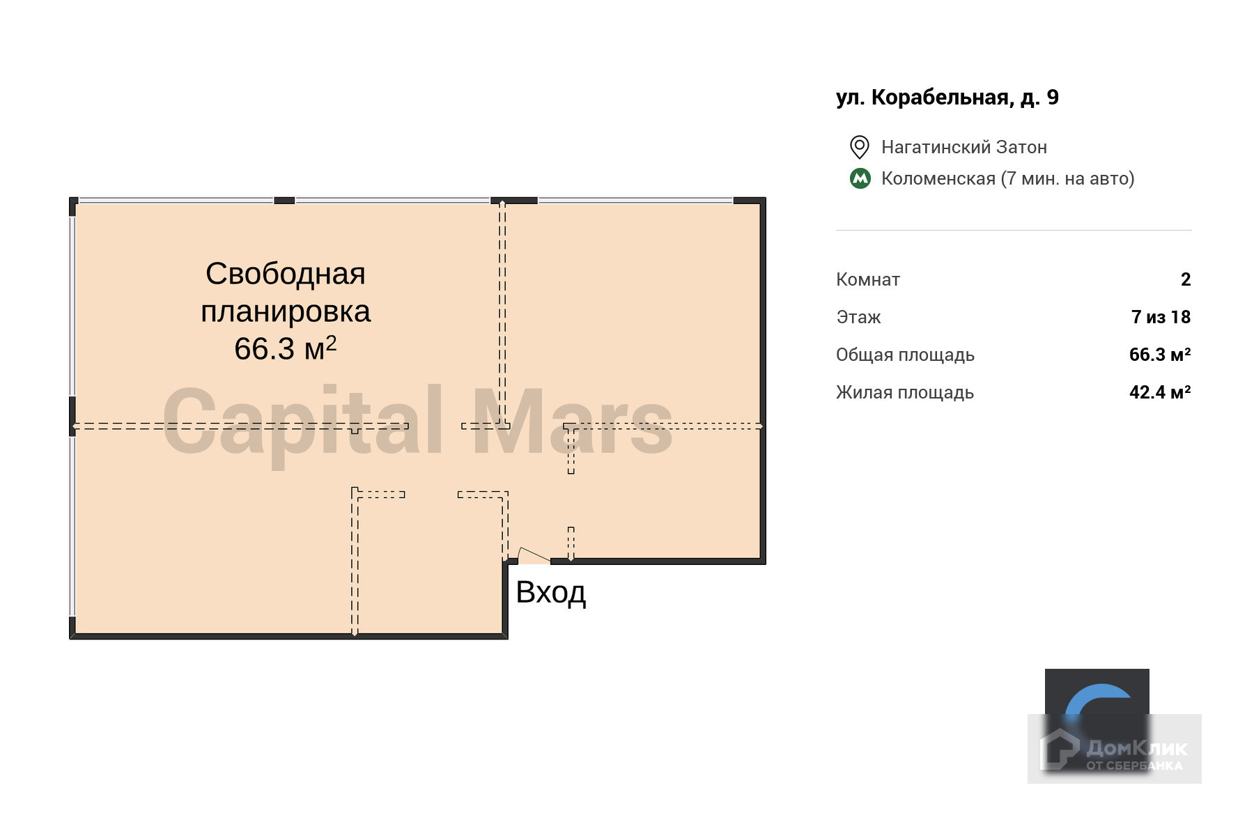 2-комнатная квартира, 66.3 м2, этаж 7 / 18, на продажу в Москве, Корабельная улица, 9