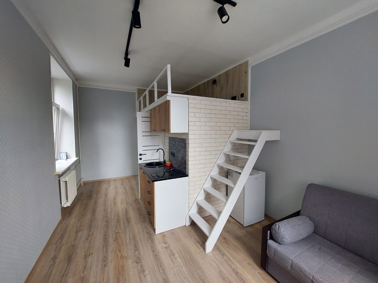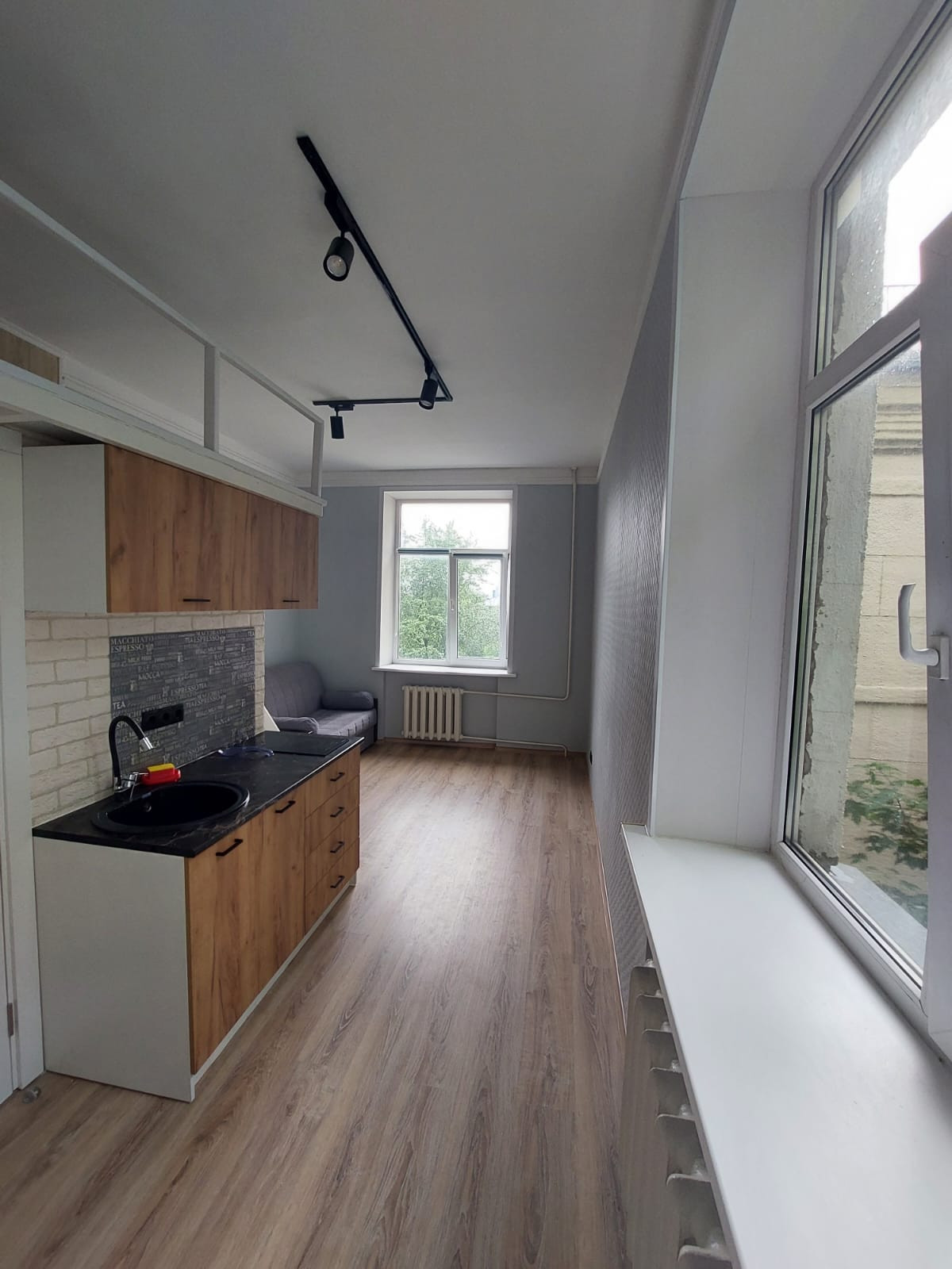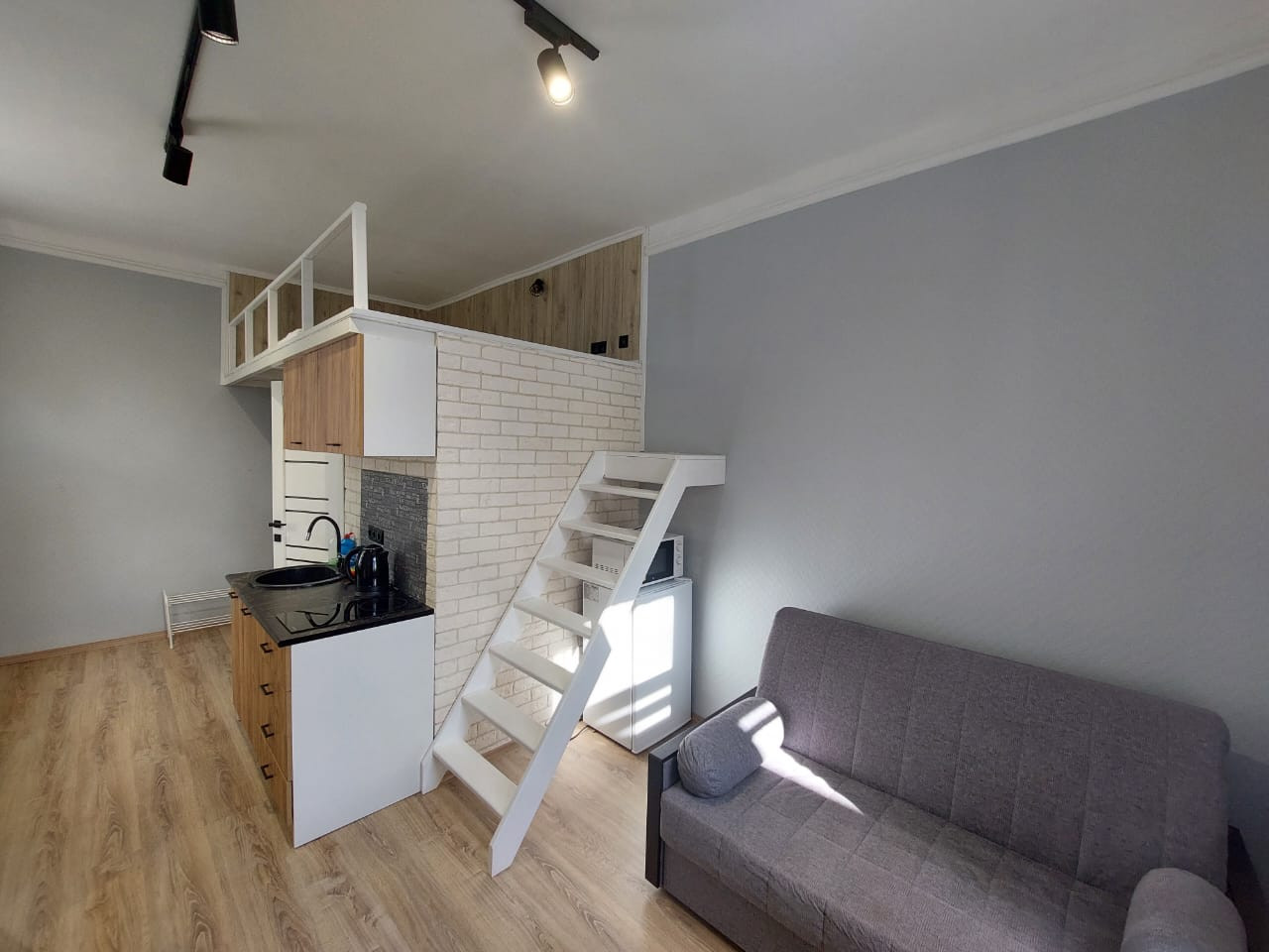25кв.м., из которых 19.5 кв.м. площадь по полу, 5кв.м. - 2й ярус. Новый дизайнерский ремонт! Стены отделаны частично клинкером/частично обои под покраску, полы ламинат. С/у в кафеле. Студия укомплектована мебелью и техникой. Идеально под сдачу в аренду.