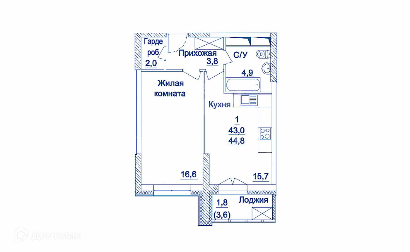 Общая площадь 44.8 м2