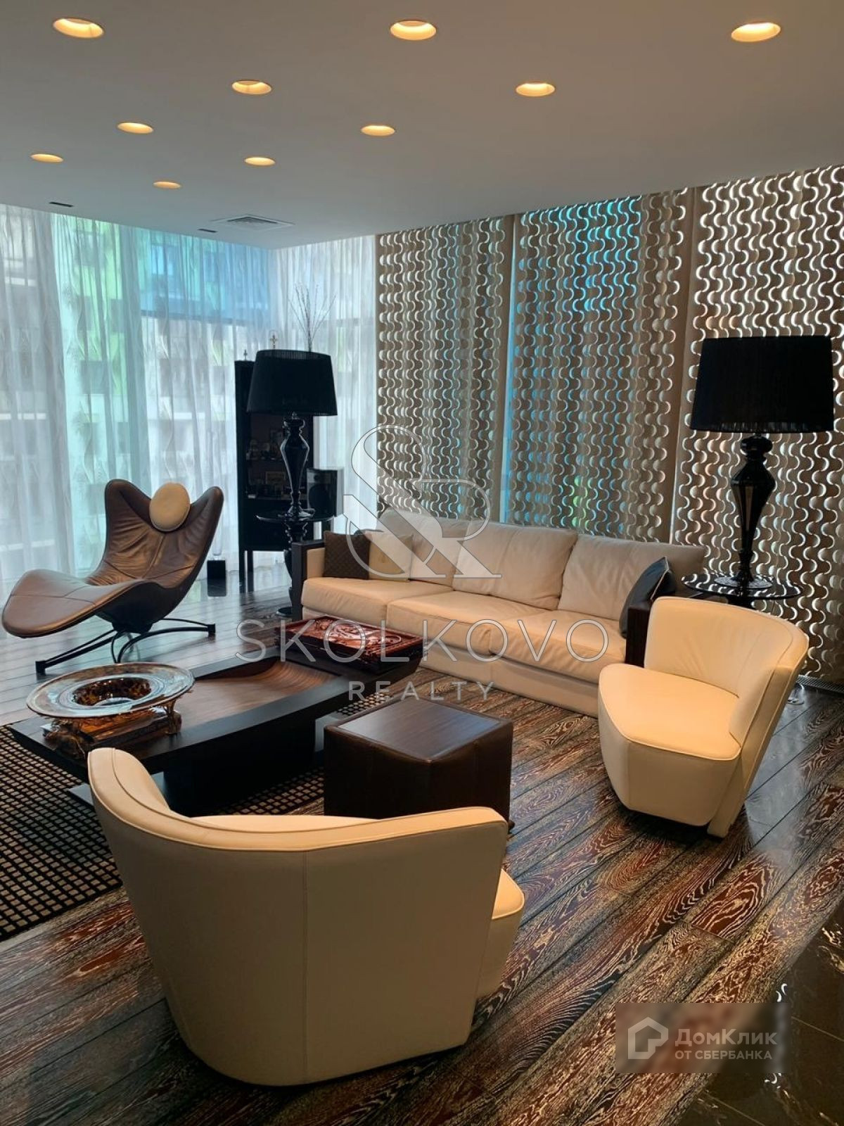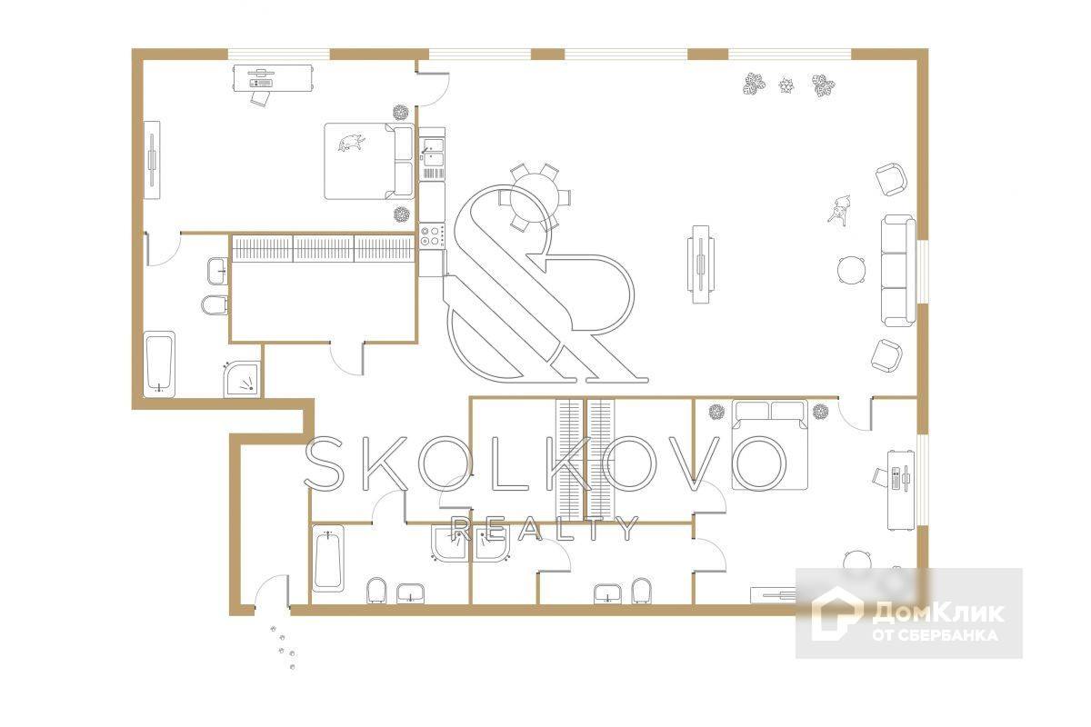Планировка квартиры включает в себя кухню - 14 кв.м, просторную гостиную - 34 кв.м, , 2 мастер-спальни (40 и 16 кв.м), 3 гардеробные, 3 полноценных с/у.