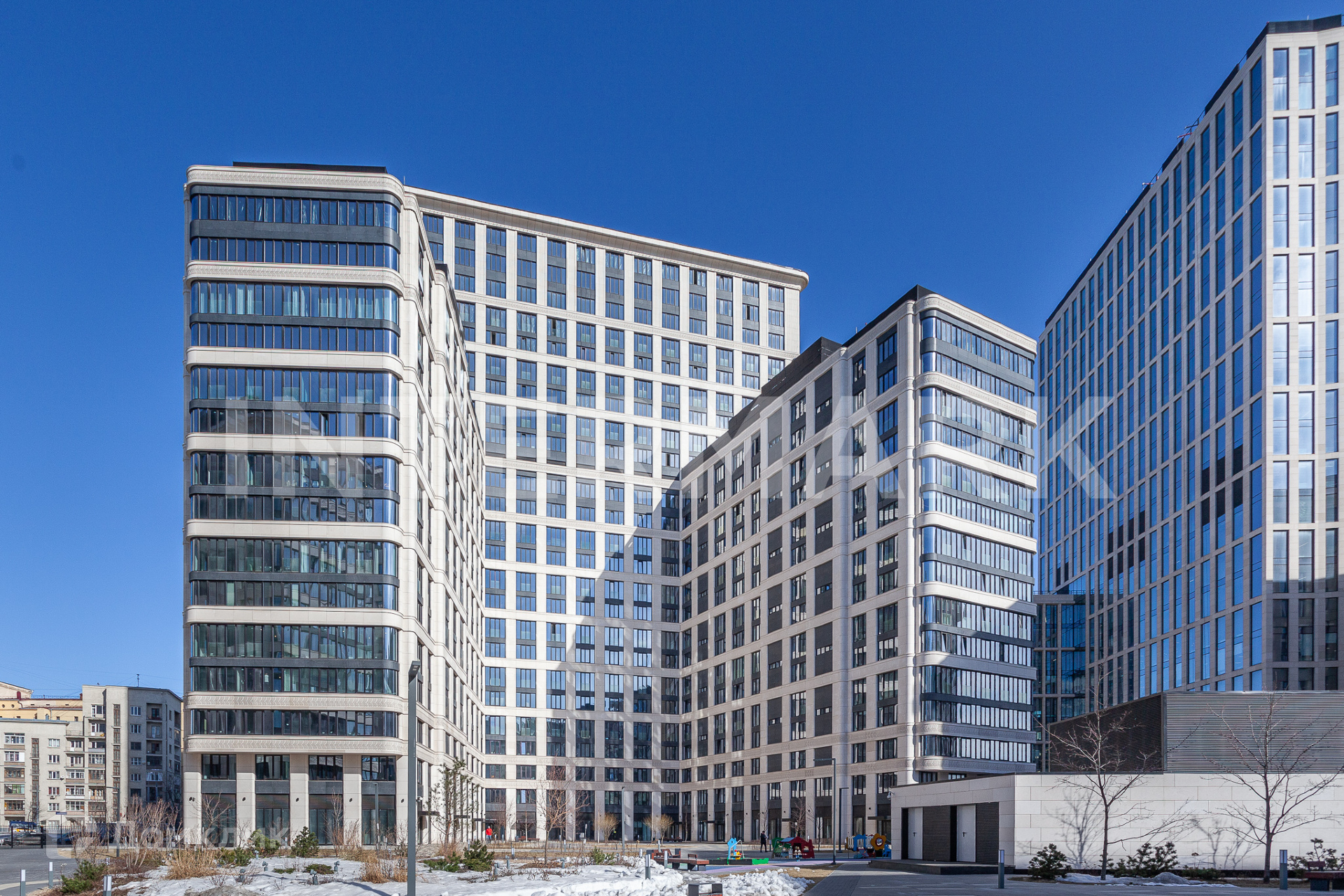 Территория комплекса свободна от машин – для автомобилей построен просторный подземный паркинг.