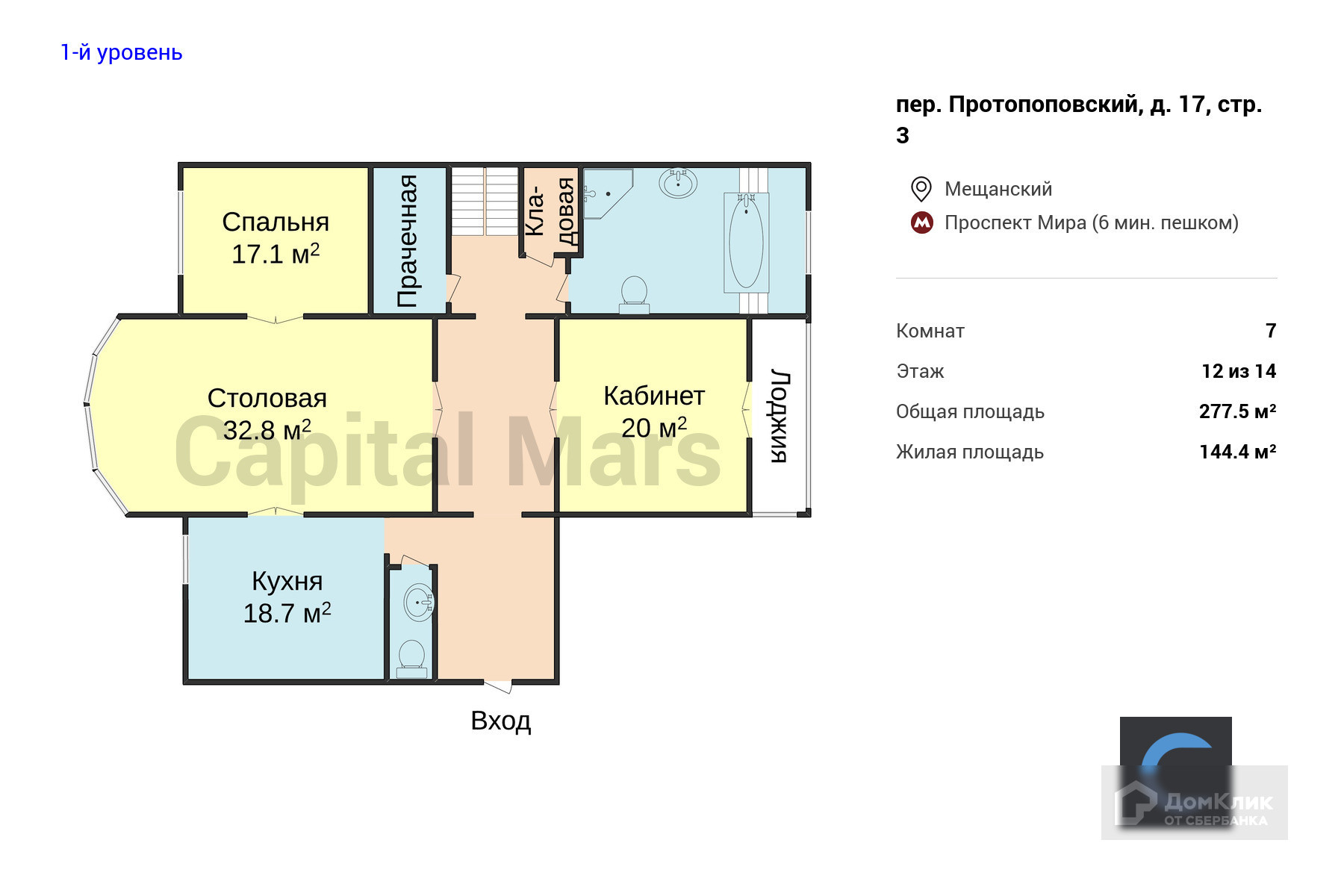 Многокомнатная квартира, 277.5 м2, этаж 12 / 14, на продажу в Москве, Протопоповский переулок, 17с3