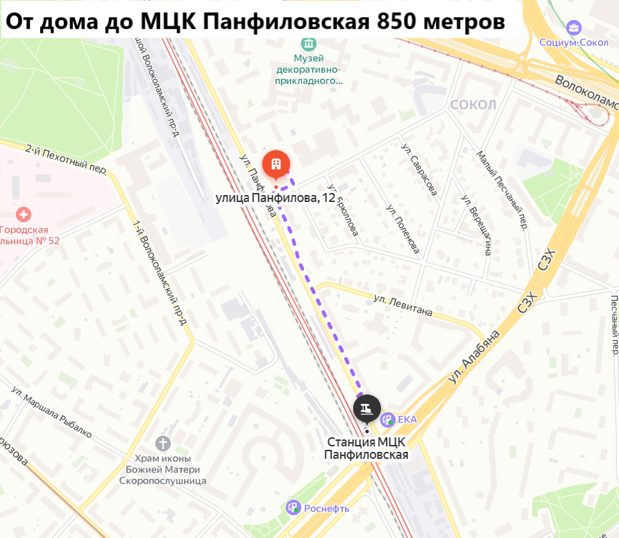 Удобная транспортная доступность: до автобусной остановки 70 метров. До МЦК Панфилова 850 метров. До метро Сокол 1,5 километра.
