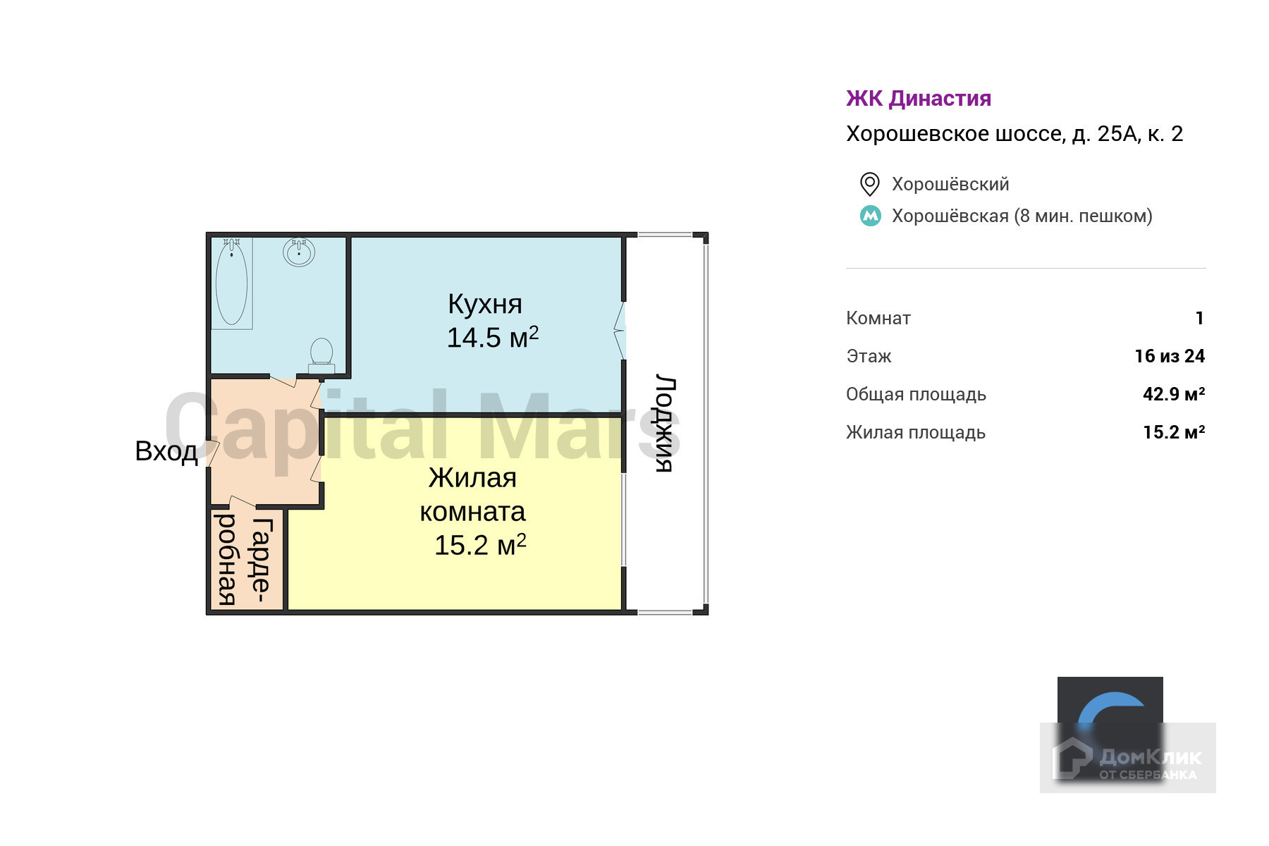 1-комнатная квартира, 42.9 м2, этаж 16 / 24, на продажу в Москве, Хорошёвское шоссе, 25Ак2