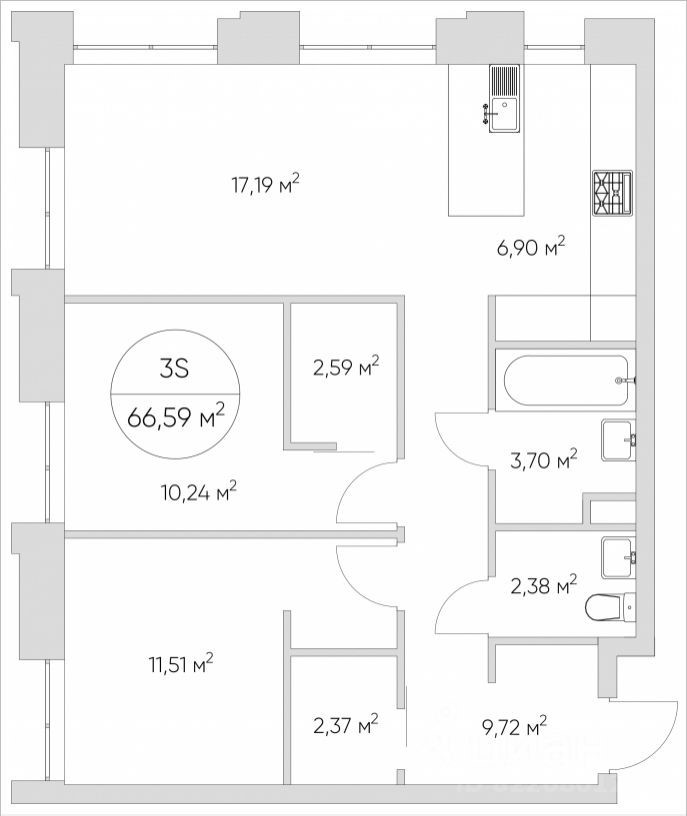 Общая площадь - 66.59 кв.м./ жилая - 38.94 кв.м./ суммарная площадь гостиной-столовой с кухонной зоной - 24.09 кв.м. Европланировка, площадь комнат позволяет разместить в них все необходимое, а в просторной кухне-гостиной удобно как готовить, так и отдыхать. Квартира угловая, идеально подойдет любителям тишины и панорамных видов. В апартаментах один совмещенный и один раздельный санузел. Высота потолков 3.0 м.