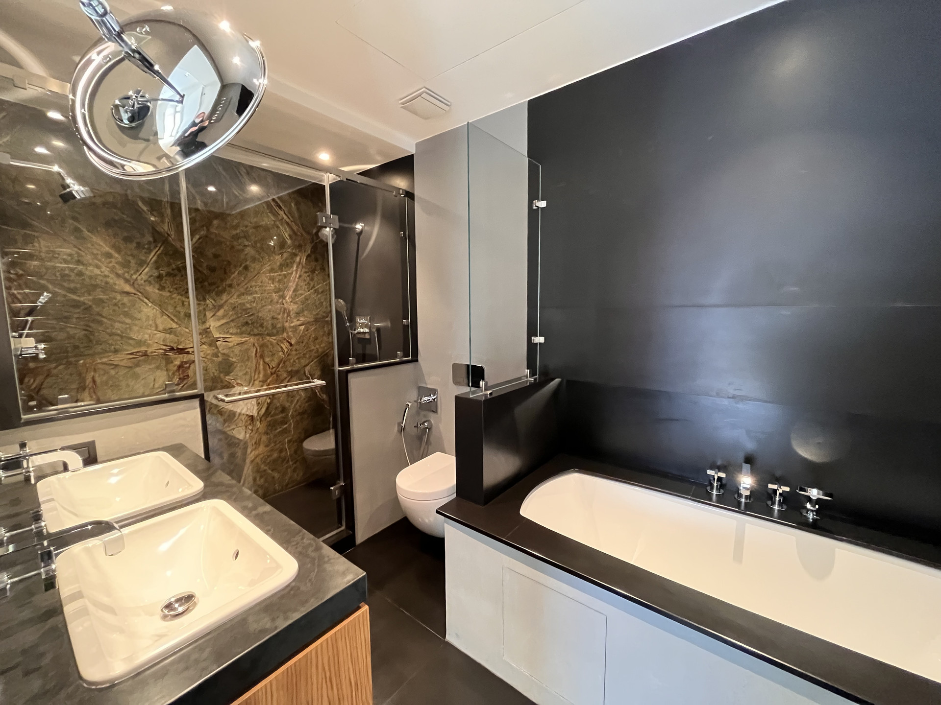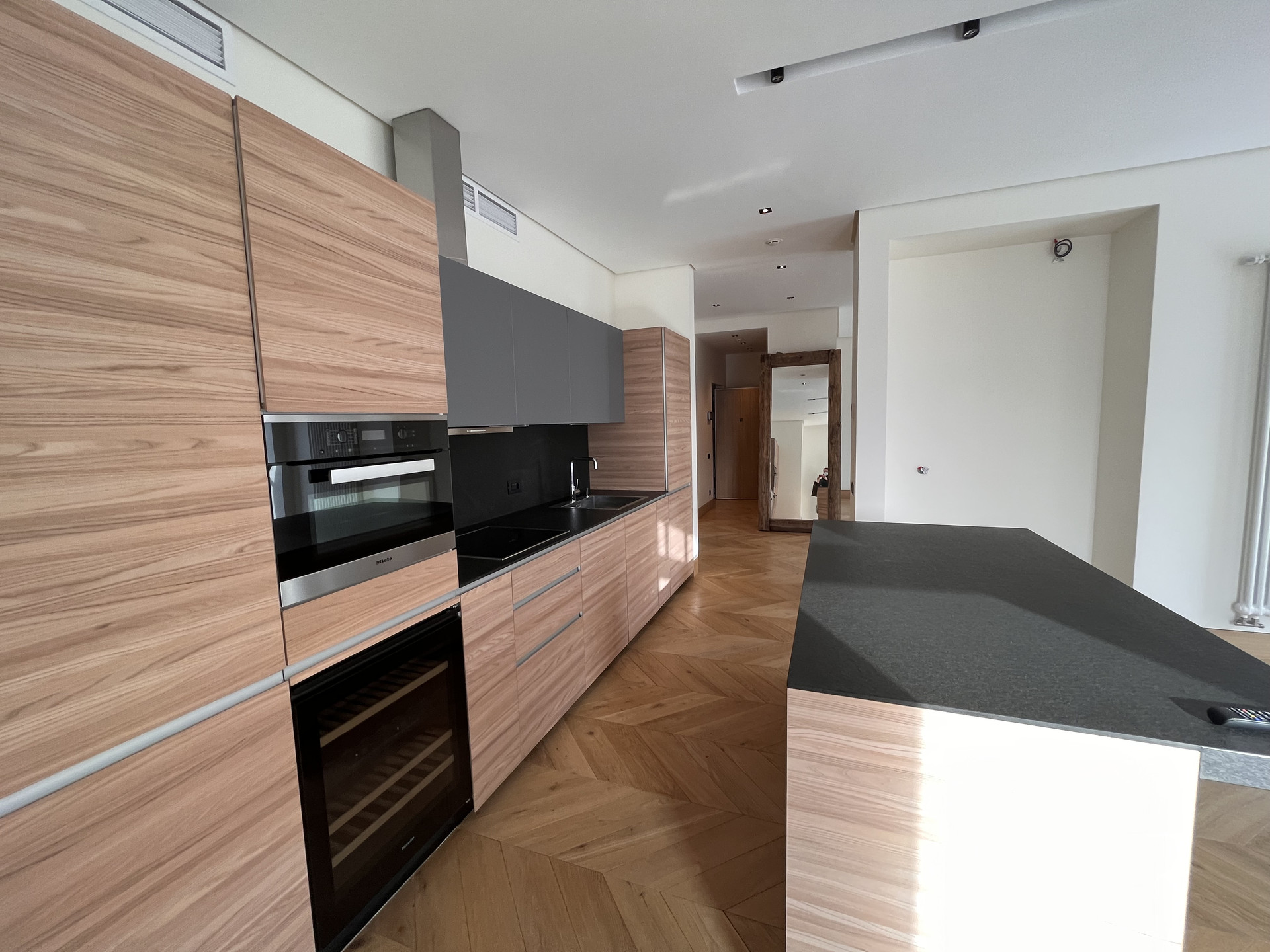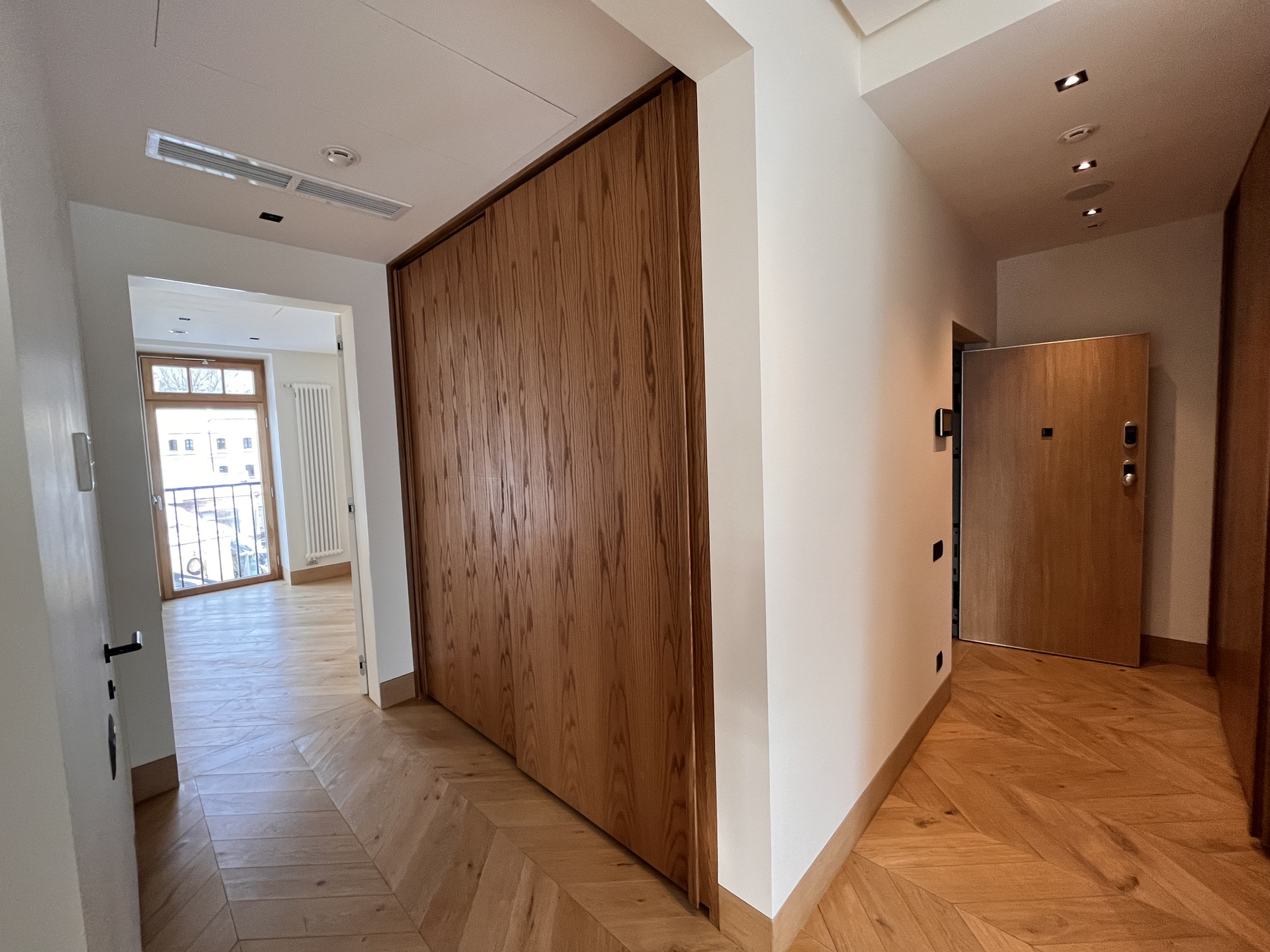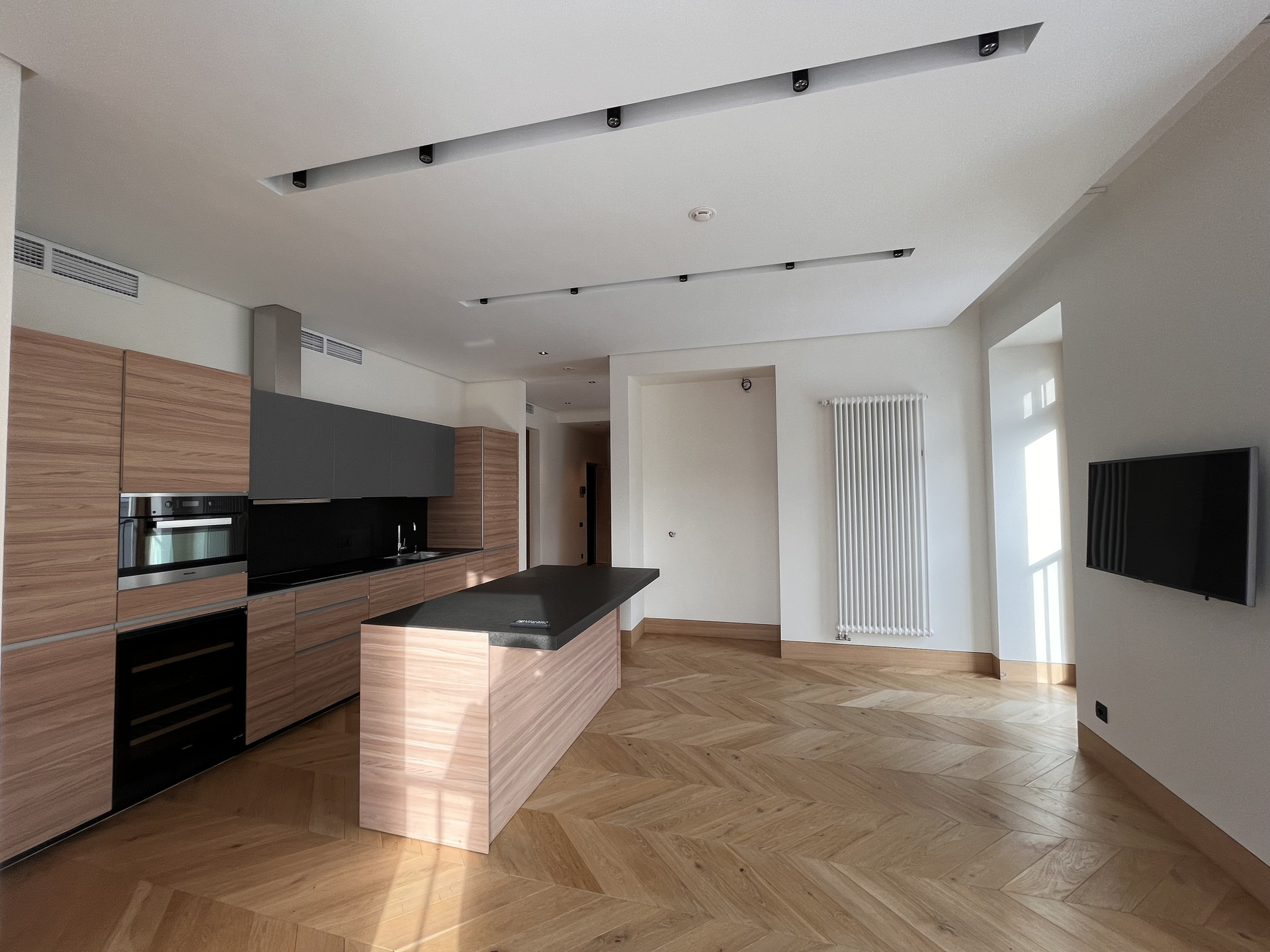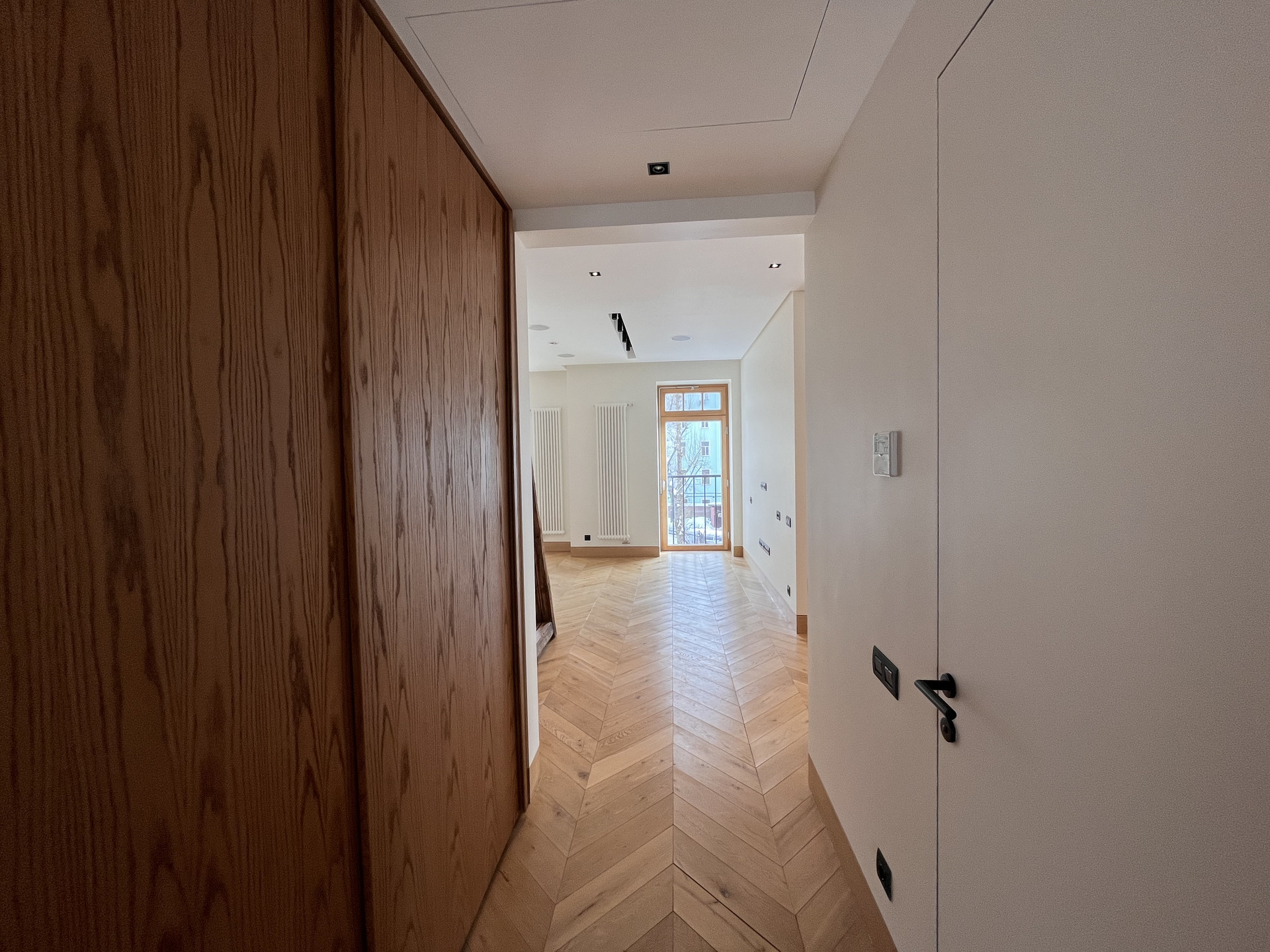 Апартамент (95,7 кв.м.), расположен на 3 этаже, имеет две просторные комнаты и две ванные комнаты. Высота потолков - 3 м. Отделка включает в себя покрытие пола натуральным дубом, полное оборудование кухни, ванной и гардеробной. Оконные рамы выполнены из канадского дуба с облицовкой внешней стороны алюминиевым профилем. Кухня оборудована встроенной бытовой техникой Miele: стиральная и сушильная машина, плита и посудомоечная машина, духовой шкаф и холодильник, а также винный шкаф. Стены, пол ванных комнат и столешница облицованы мрамором и сланцем. Встроенная акустическая система c мощным Hi-Fi-усилителем позволяет добиваться профессионального качества звука во всех помещениях апартаментов (Bluetooth, Wi-Fi, AirPlay). Звук APart и Yamaha. Телевизор нового поколения Samsung 4К с возможностью интерактивного использования предоставляемых сервисов. Цифровое телевидение в HD-качестве. Широкополосный̆ доступ в Интернет; Wi-Fi-роутер. Неограниченное число цифровых телефонных линий. Индивидуальное кондиционирование с системой̆ VRV (Electrolux). Выделенная мощность электроснабжения – 14 кВт. Система очистки и подготовки воды, резервная (бойлерная) система бесперебойного обеспечения горячей водой. Система отопления с регулированием температуры приборов от температурных датчиков. Радиаторы Arbonia. Многоуровневая система охраны: видеонаблюдение, охранная сигнализация, контроль доступа, охрана периметра объекта. Бесшумные скоростные лифты Kleemann с индивидуальной отделкой лифтовых кабин.
